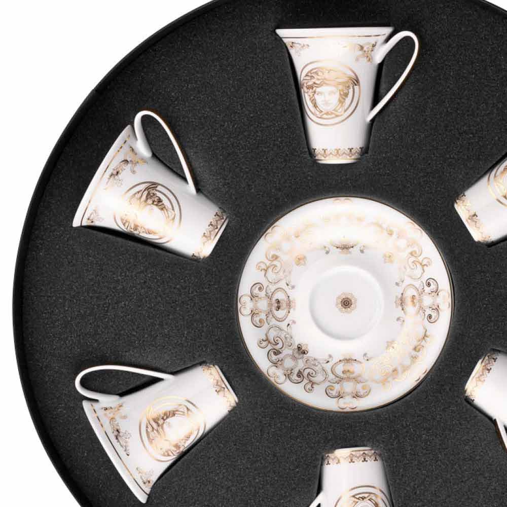 Set filxhani ekspres prej porcelani Versace Medusa Gala me 6 pjesë Ky grup prej 6 kupash përmban të gjithë sqimën dhe luksin e koleksionit të ri të tavolinave Medusa Gala , i cili riinterpreton motivet tradicionale të Versace në dizajn dhe dekorim: ikona që përshkruan Medusa alternohet me ornamente të rafinuara barok në një filigran ari të çmuar. Një efekt kontrasti emocionues midis çiltërsisë së porcelanit dhe arit të pastër i jep jetë një ambienti të përsosur, modern dhe në të njëjtën kohë unik. E pasuruar me motive dhe dekorime tërësisht në ar, Medusa Gala vjen edhe në versionin edhe më luksoz "Gold", perfekt për të integruar dhe zbukuruar më tej tryezën.