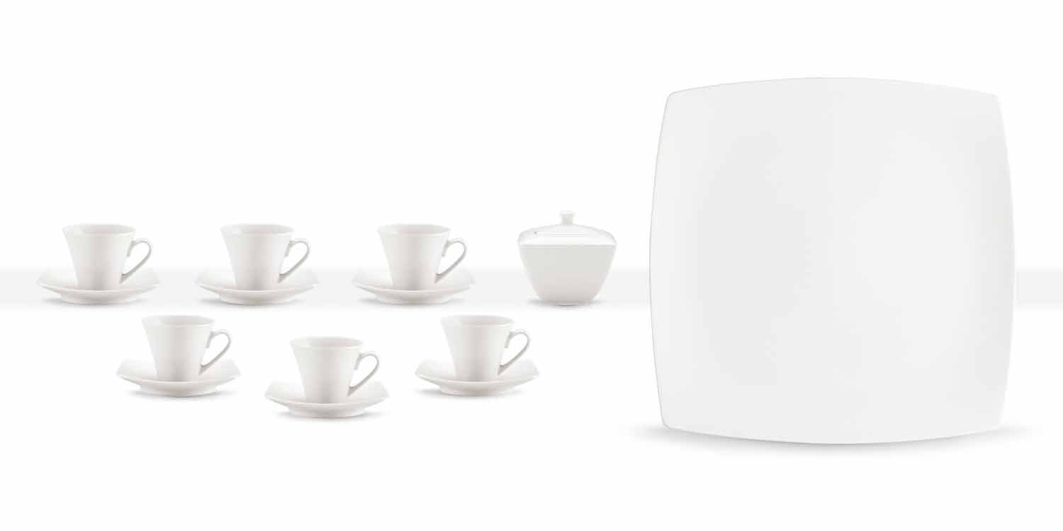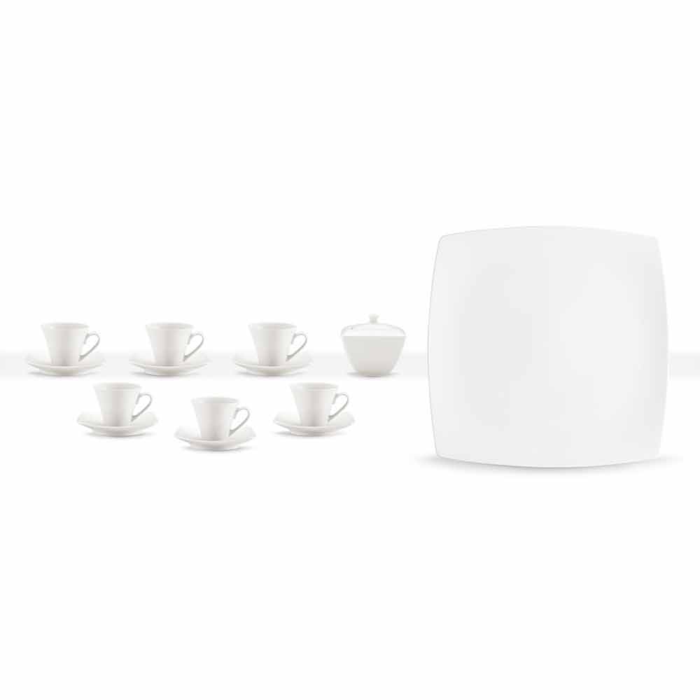 Sete gotash kafeje dhe tas me sheqer me pjatë, dizajn modern në porcelan të bardhë, 8 copë.