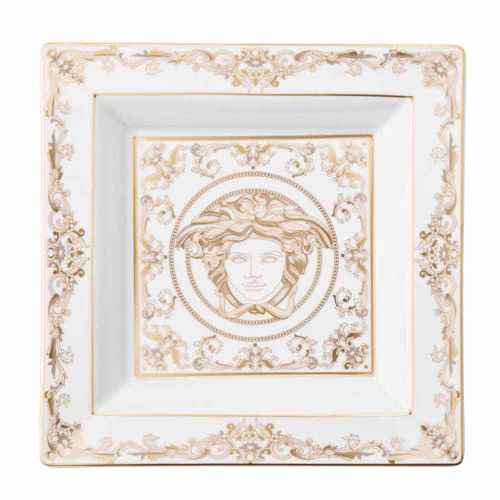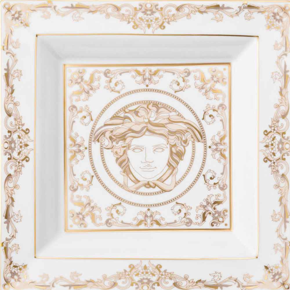 Medusa - Rosenthal takohet me Versace:Shërbimi i parë prej porcelani nga Versace Versace dhe Rosenthal janë të dyja sinonime të përsosmërisë dhe cilësisë së lartë. Rosenthal ia detyron famën e saj mbarëbotërore aftësisë së saj për të kombinuar gjithmonë traditën dhe inovacionin, ndërsa Versace është i njohur në të gjithë botën për shkëlqimin e tij unik dhe luksoz. Nga bashkëpunimi mes këtyre kompanive prestigjioze, lindi një nga shërbimet e para të koleksionit "Rosenthal meets Versace" : shërbimi " Meduza" nga Gianni Versace që i përket koleksionit "Ikarus" që pasqyron si kurrë më parë botën e paimitueshme të pasurisë dhe ngjyrat e Versace. Pika kryesore e këtij koleksioni është një kokë e mrekullueshme e artë Medusa, marka e pagabueshme Versace, e rrethuar nga dekorime ekspresive barok. Koka e Medusës është e pranishme – në qendër – në të gjitha kupat dhe kanat, si dhe në të gjitha pjatat e mëdha dhe të vogla të koleksionit “Meduza”. Ngjyrat e vërteta aristokratike - e kuqja e ndezur, ari elegante dhe e zeza - dhe modelet dhe stolitë e përpunuara filigrani i japin kokës Medusa një kornizë ngjyrash luksoze me elegancë të paparë. Koleksioni "Medusa" përfshin një servis të plotë tavoline dhe një servis kafeje si dhe aksesorë të shumtë. Filxhanë të mëdhenj mëngjesi për kapuçino dhe latte, pjata dhe tasa me supë janë pjesë e koleksionit aksesorë dhuratash po aq të vlefshëm dhe shumë personal si unaza e pecetës, mbajtësja e qirinjve, vazot dhe një set elegant për duhanpirës. Dy koleksionet e qelqit " Medusa Lumière" dhe "Méandre" si dhe koleksioni i takëmeve "Medusa Gold" plotësojnë tryezën elegante, plot ngjyra në stilin unik të botës Versace.
