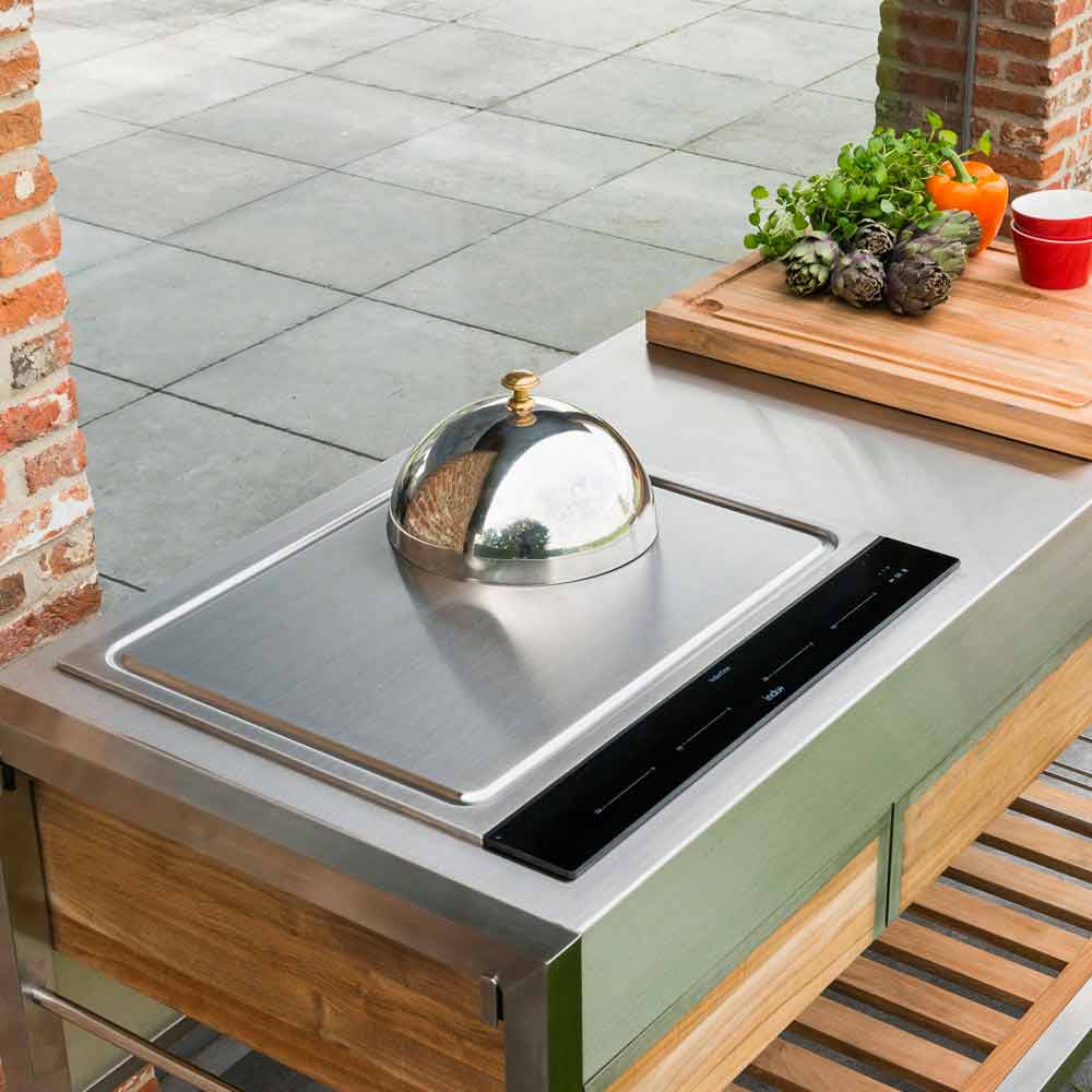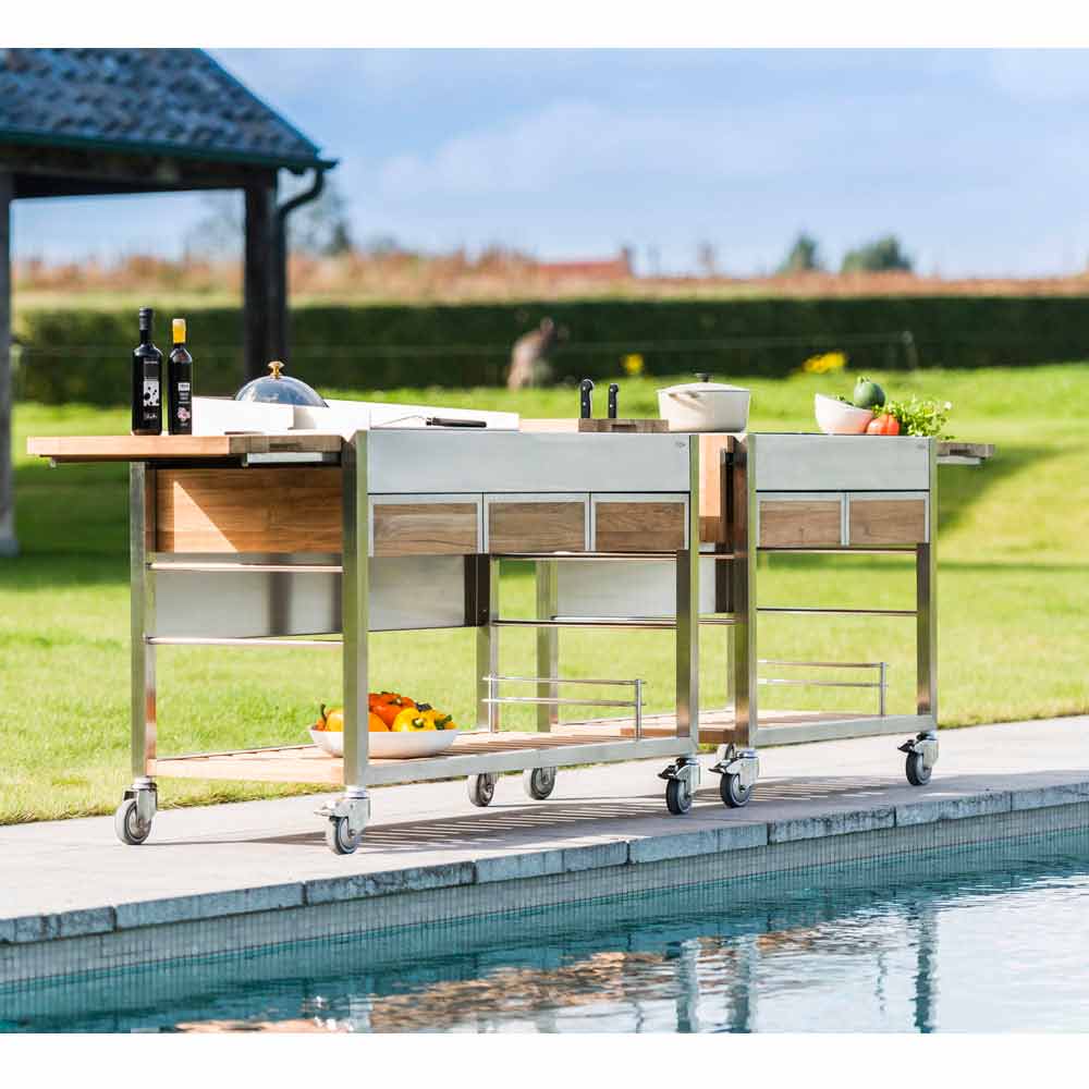 Është një kuzhinë e jashtme me rrota e karakterizuar nga një strukturë e fortë që përdor çelik inox të krehur dhe dru tik të fortë, të cilin mund ta vendosni kudo që dëshironi: në kopsht, në tarracë ose në pishinë, për një efekt luksoz dhe në modë.