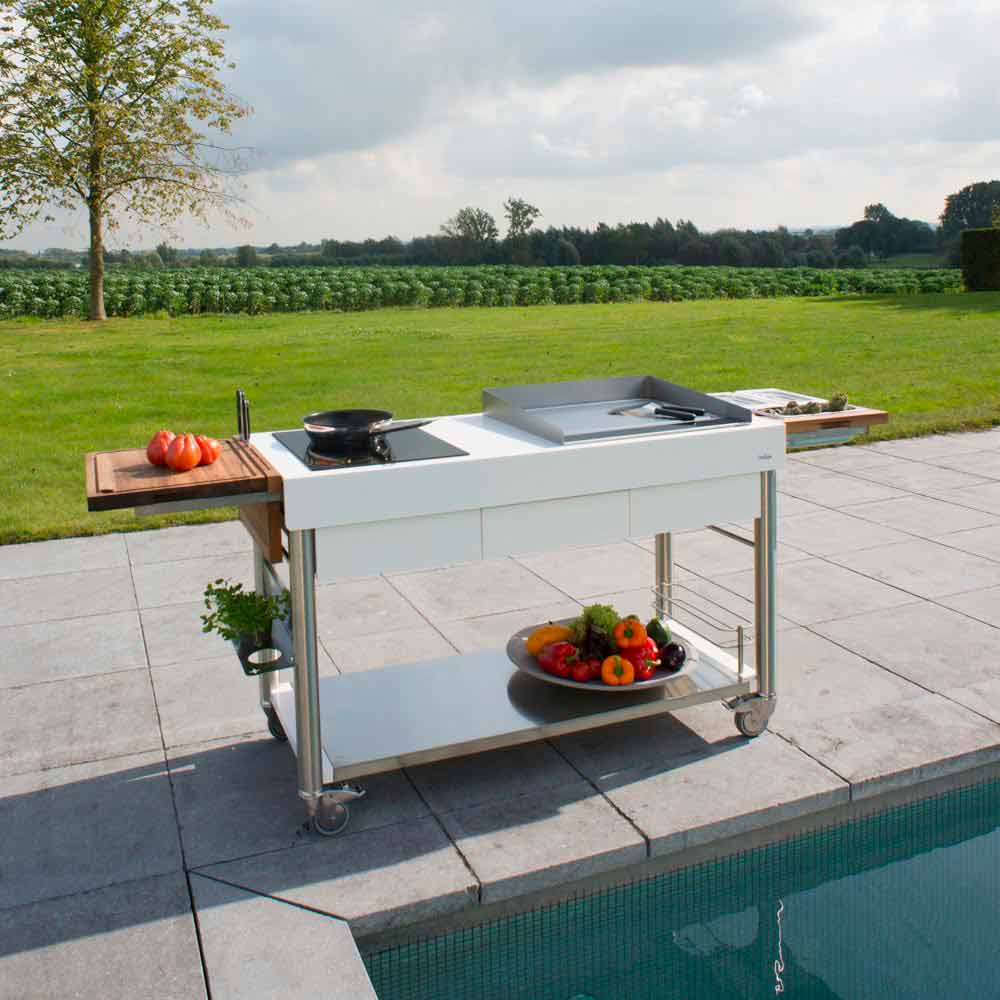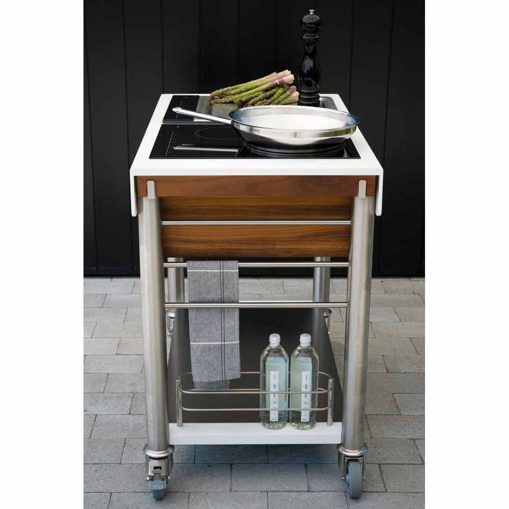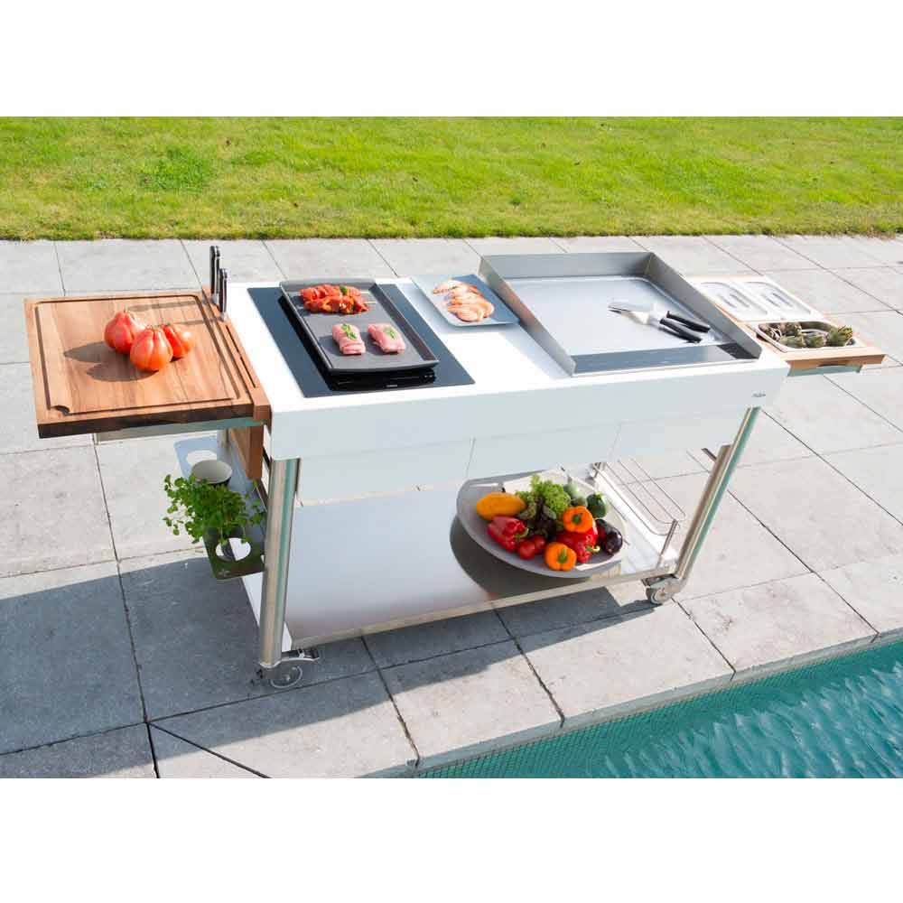 Shtë një kuzhinë në natyrë në rrota e karakterizuar nga një strukturë e fortë që përdor çelik inoxi të krehur , përfundon dhe krye të përbërë me cilësi të lartë me dru arre të ngurta, ju mund të vendosni aty ku preferoni: në kopsht, në tarracë apo pishinë, për një efekt luksoz dhe trend.