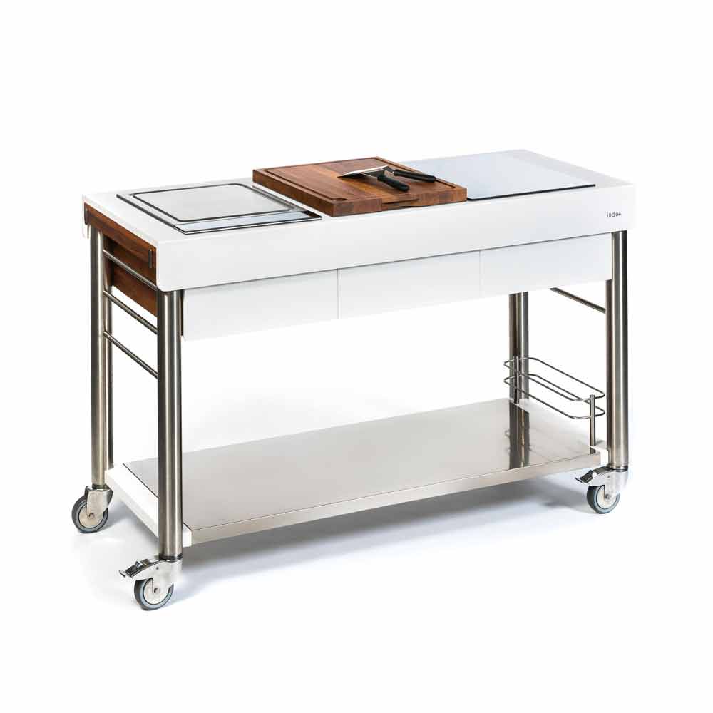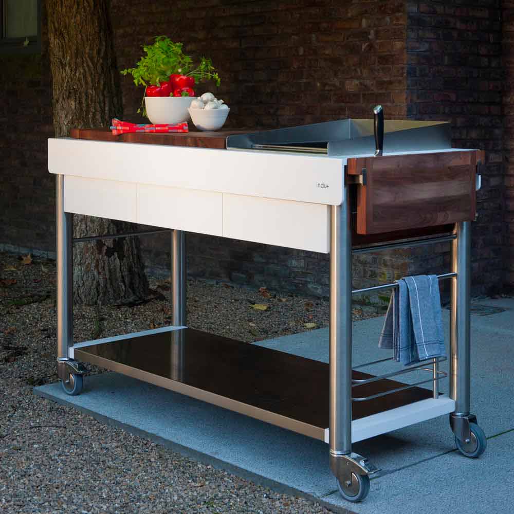 Kuzhinë e jashtme në rrota në çelik inox dhe dru tik me pllaka të këmbyeshme, dy madhësi në dispozicion, dizajn modern, me cilësi të lartë.