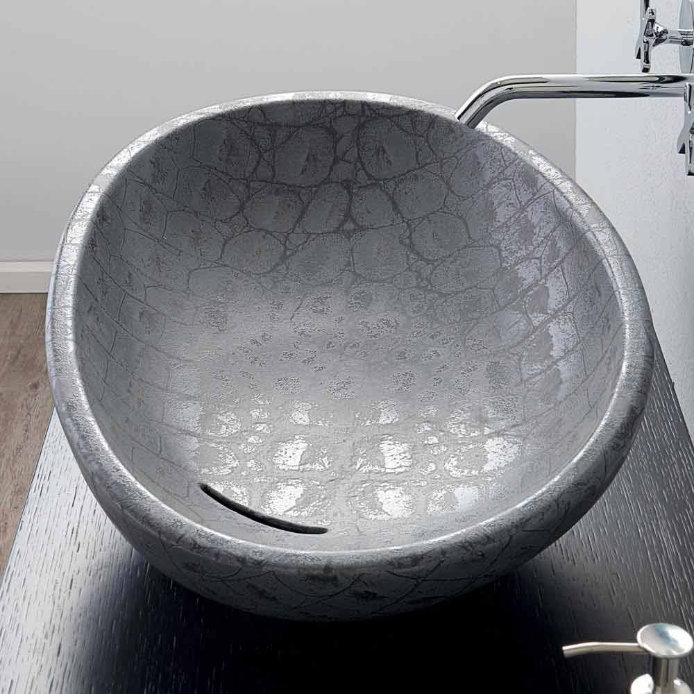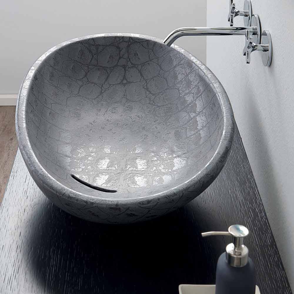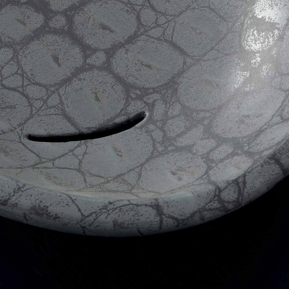 Lavaman gri me shkëlqim të stampuar nga tavani i tavolinës i bërë nga Italia Me shkëlqim është protagonistja e lavamanit të banjës tuaj në sajë të formës së saj të butë dhe të zgjatur. Prodhuar në Itali nga artizanë të aftë në një përfundim qeramik gri caiman.
