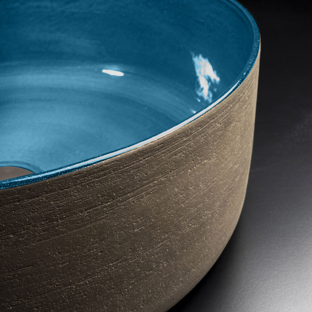 Lavaman banaku i rrumbullakët i prodhuar tërësisht në Itali në balte zjarrduruese , i kthyer me dorë me gatim të tretë me zjarr. Estetika e tij karakterizohet nga kombinimi perfekt i pjesës së jashtme të depiluar dhe të hidroizoluar natyrale me një stil më rustik dhe brendësinë blu të shkëlqyeshme dhe të vitrifikuar me një shije më elegante dhe të rafinuar. Çdo element i lavamanit është punuar me dorë për t'i dhënë jetë një zgjidhjeje ekskluzive mobilimi, me vlerë të lartë dhe me cilësi të pashoqe.