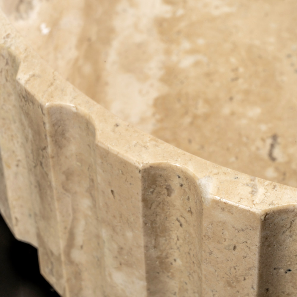 Lavamani i banakut të travertinës kombinon mjeshtërinë dhe një estetikë të rafinuar luksoze. Çdo pjesë, e gdhendur nga një bllok i vetëm mermeri travertin, është unike falë venave të saj të veçanta dhe variacioneve të ngjyrave që e bëjnë atë ekskluzive. Mbetjet e klikimit , e bërë nga i njëjti mermer, jo vetëm që plotëson dizajnin, por gjithashtu siguron funksionalitet të patëmetë. Ky lavaman është një zgjedhje elegante për ata që kërkojnë një mobilje të vlefshme që mund ta shndërrojë një banjë në një hapësirë luksoze.