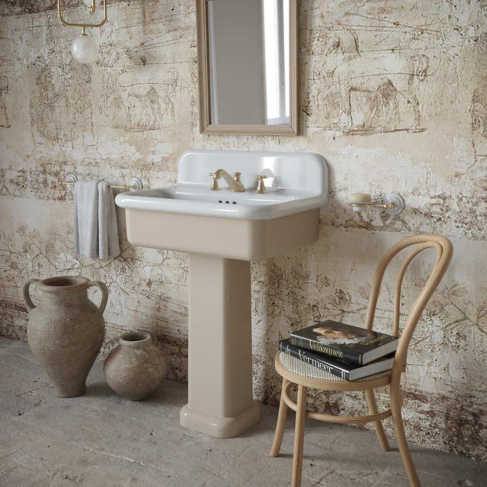 Lavaman banjoje me strukturë drejtkëndore në jute dyngjyrëshe dhe qeramikë e bardhë me kolonë qeramike e disponueshme në 2 finitura.
