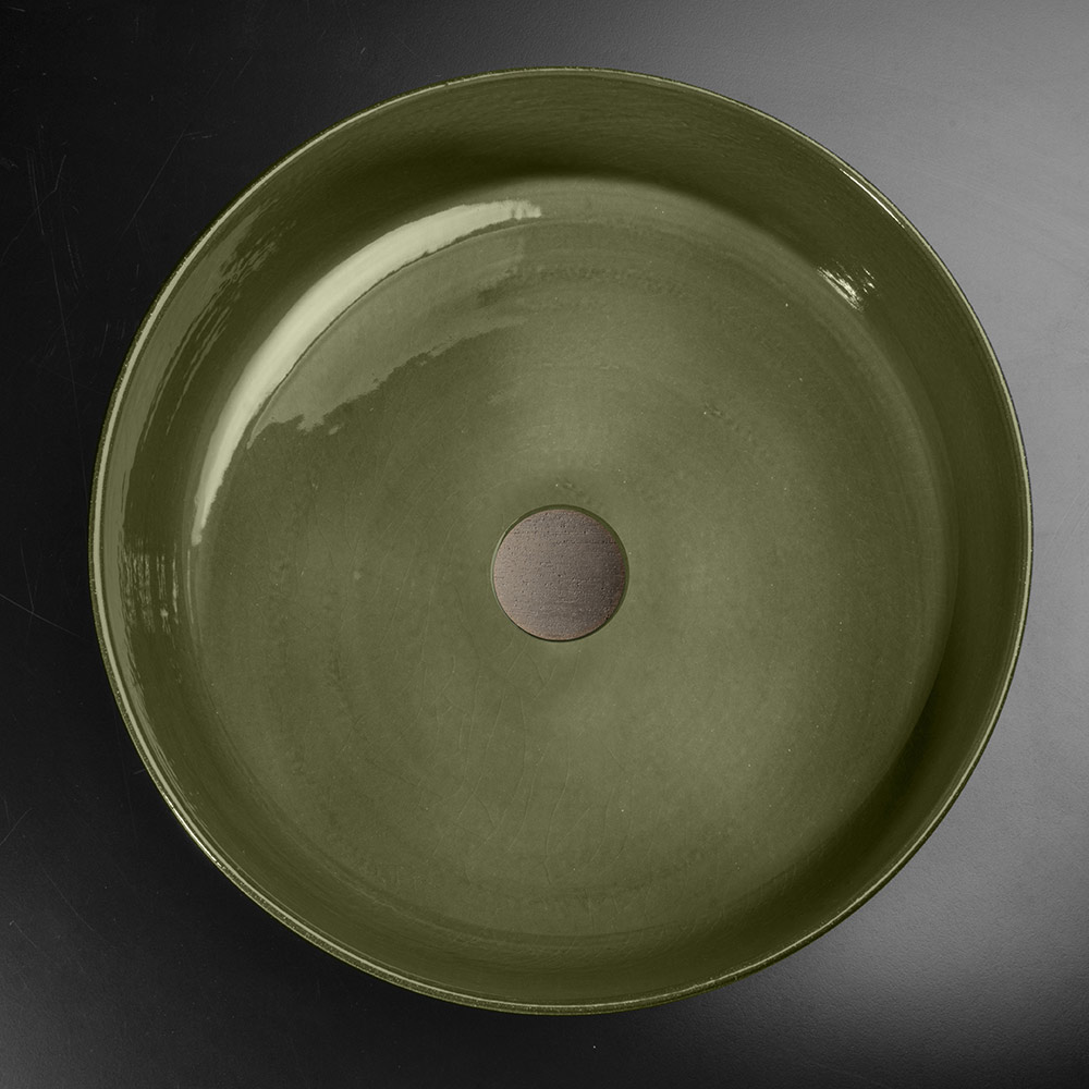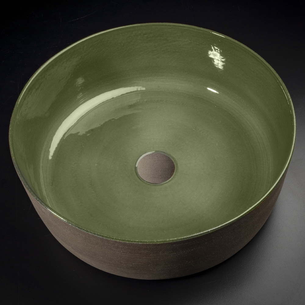 Lavaman banak me formë të rrumbullakët i prodhuar në Itali në argjilë zjarrduruese , i kthyer me dorë me gatim të tretë me zjarr. Estetika e tij karakterizohet nga kombinimi perfekt i pjesës së jashtme të depiluar dhe të papërshkueshëm nga uji me një stil më rustik dhe brendësinë e shkëlqyeshme dhe të qelqyer në një fund jeshil, një ngjyrë që të kujton pranverën dhe lulëzimin e bimëve, duke rikthyer kontaktin origjinal me natyrën. . Çdo element i lavamanit është punuar me dorë për t'i dhënë jetë një zgjidhjeje ekskluzive mobilimi, me vlerë të lartë dhe me cilësi të pashoqe.