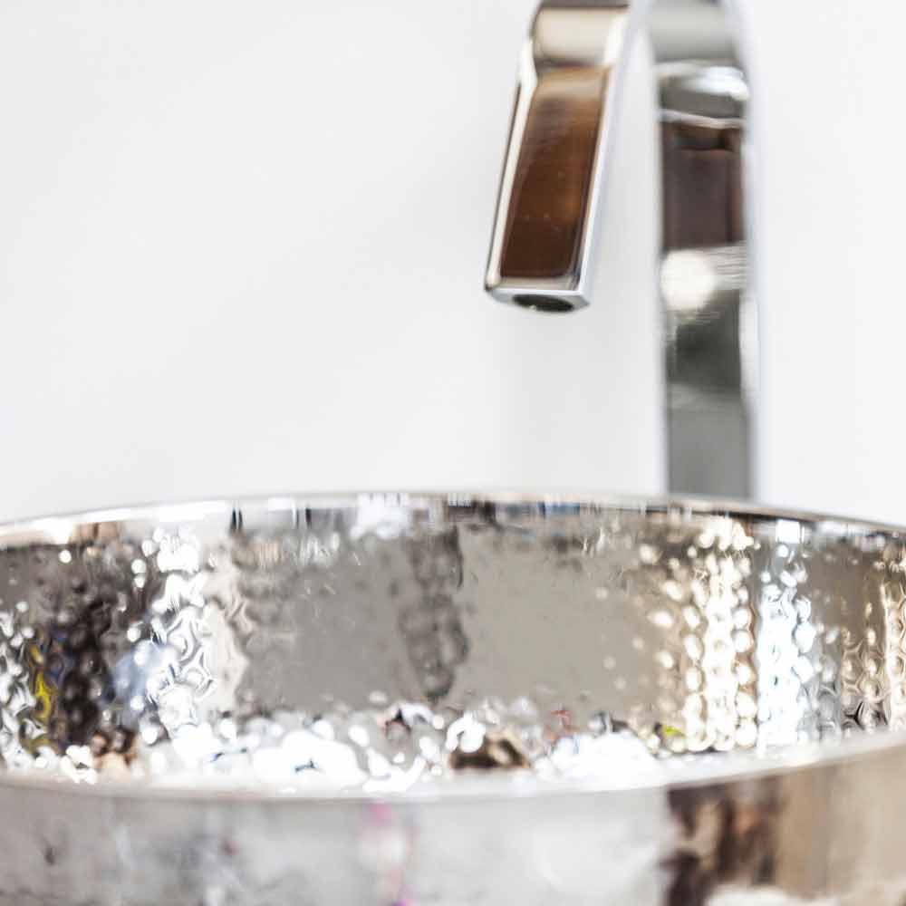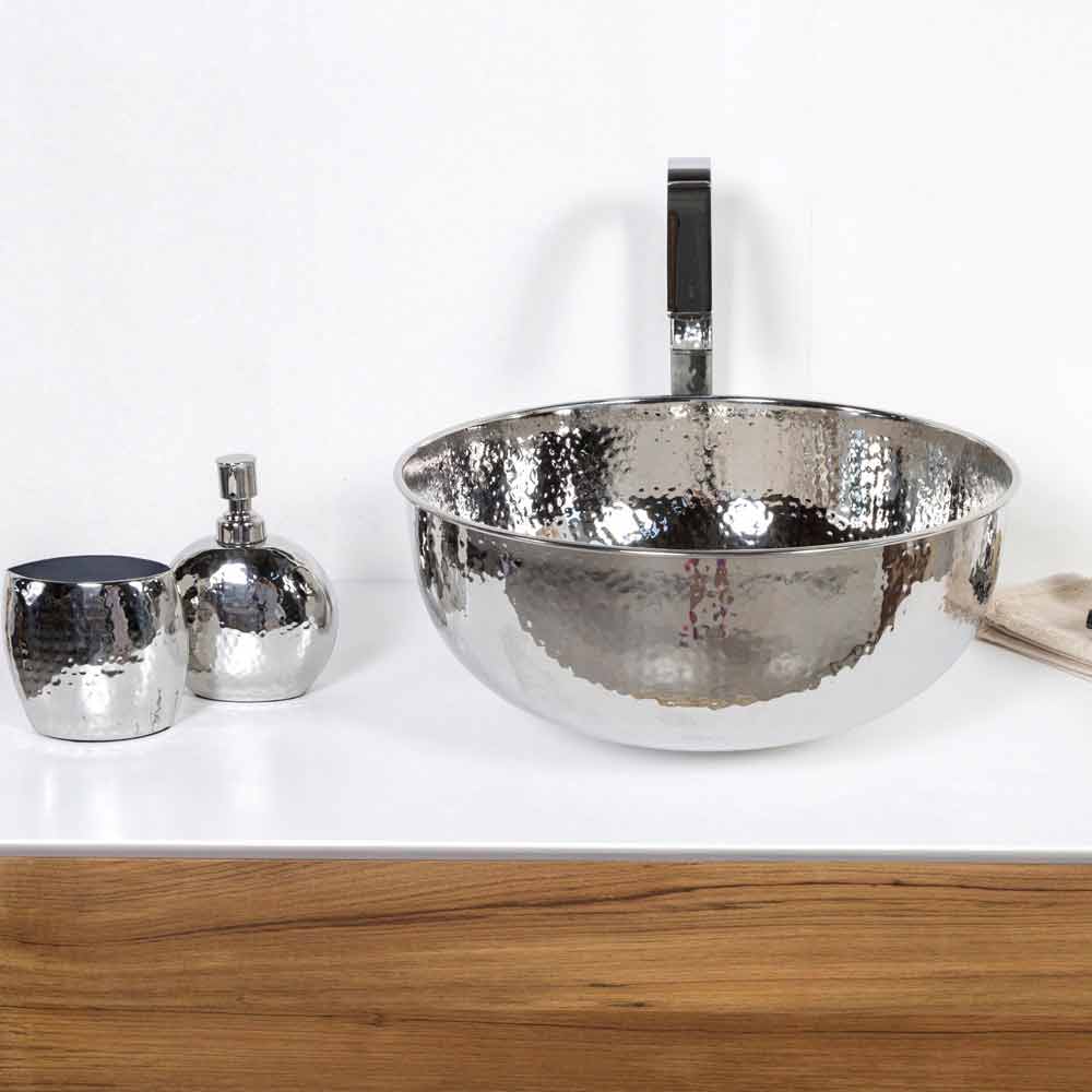 Lavaman modern në bronz të kromuar me çekiç . Buza e sipërme e përdredhur i jep lavamanit më shumë forcë dhe lehtësi pastrimi.