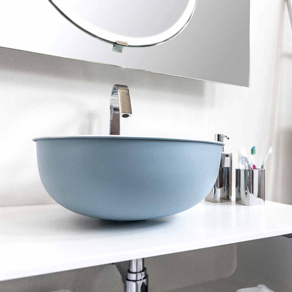 Legen tavani në metal me tas. E bardhë me shkëlqim me xham nga brenda, me ngjyrë mat nga jashtë me efekt të përafërt. Skaji i sipërm "i përdredhur" i jep lavamanit më shumë forcë dhe lehtësi pastrimi.