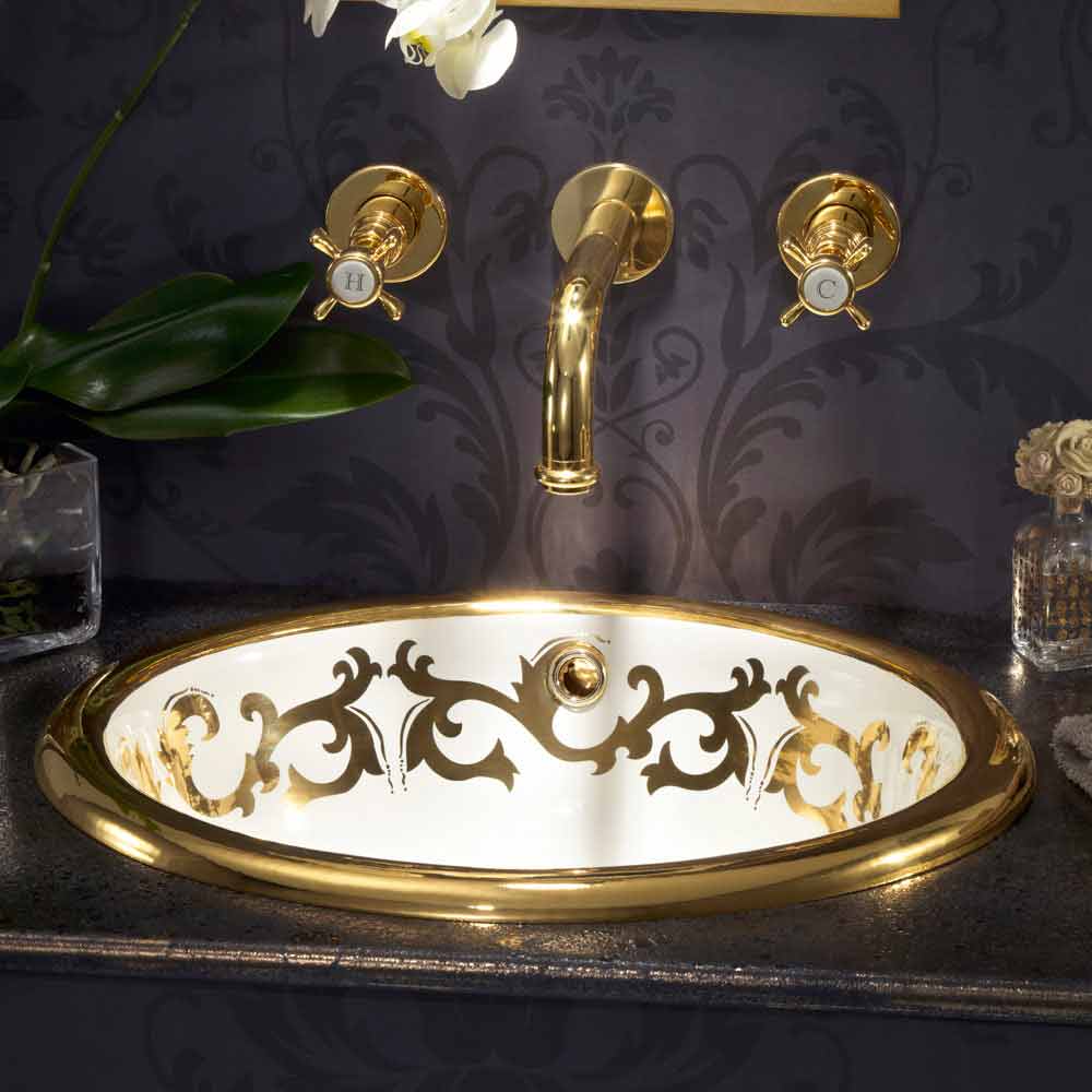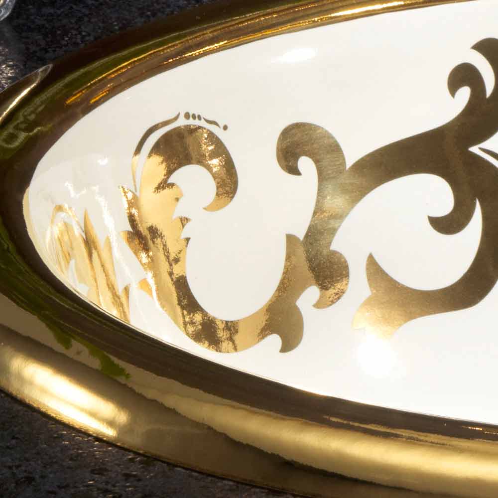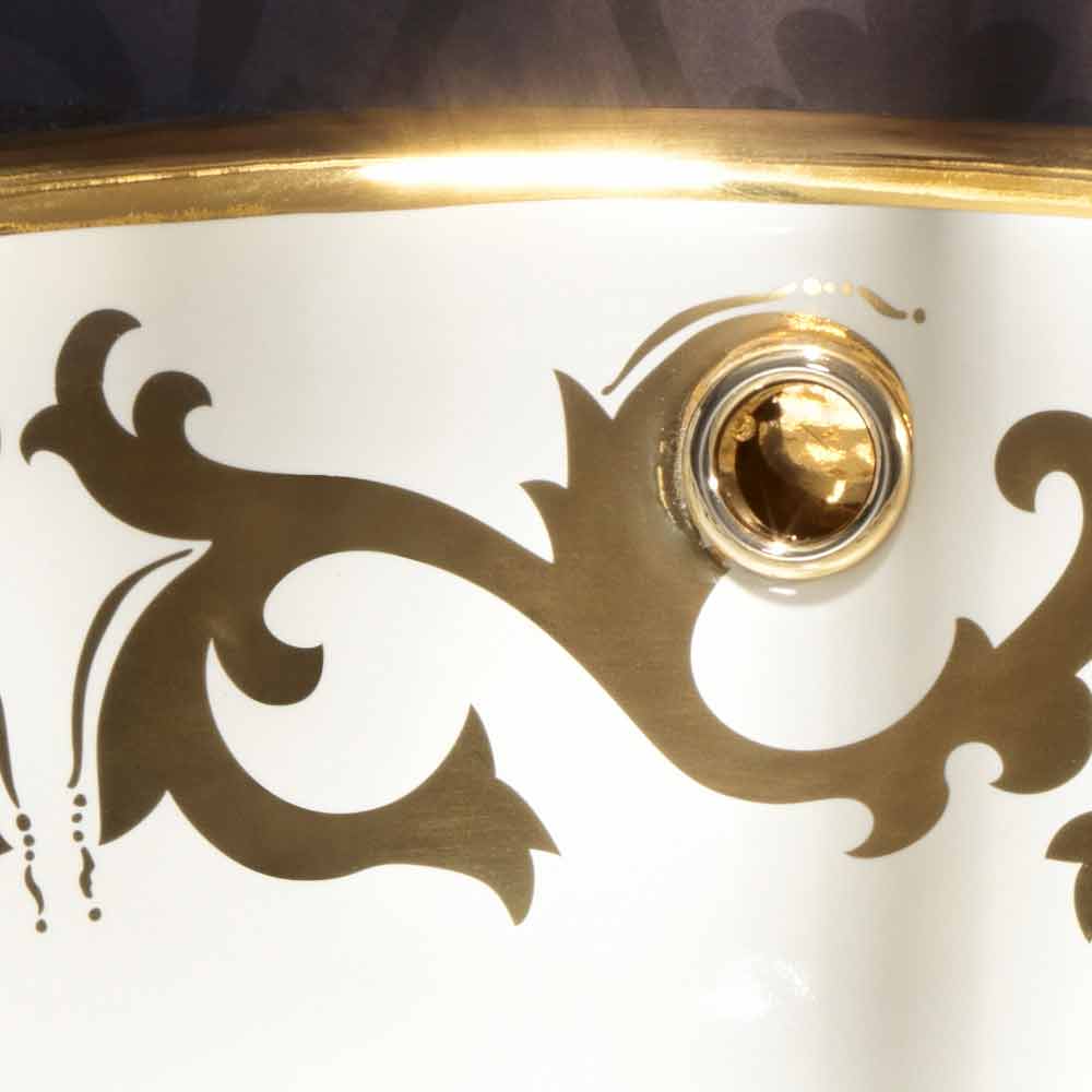 Lavaman i integruar i banjës i bërë në Itali me dorë argjile të punuar me dorë, zbukuruar me qëndisje ari dhe dore të skajshme të pikturuara me ar 24k.