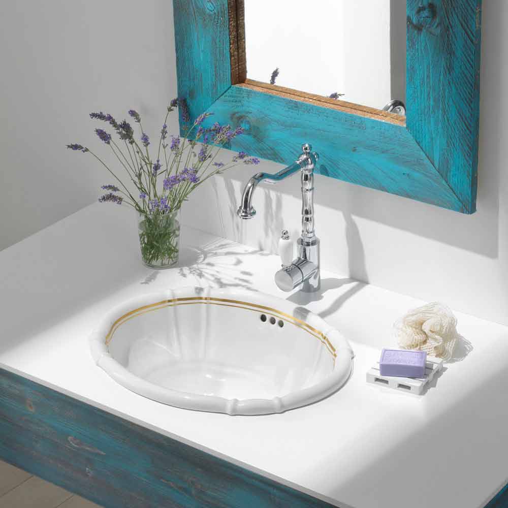 Mbushëse rrethore e ndërtuar në porcelan dhe ari 24k, Santiago Banjë, lavaman i integruar i punuar me dorë në Itali në porcelan të bardhë të hollë me një vijë të dyfishtë në ari 24k në buzë.