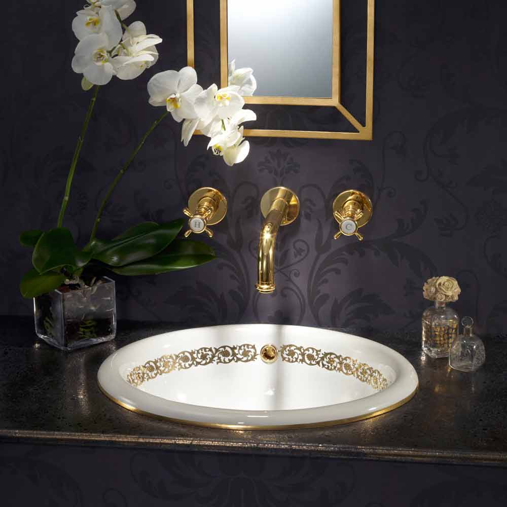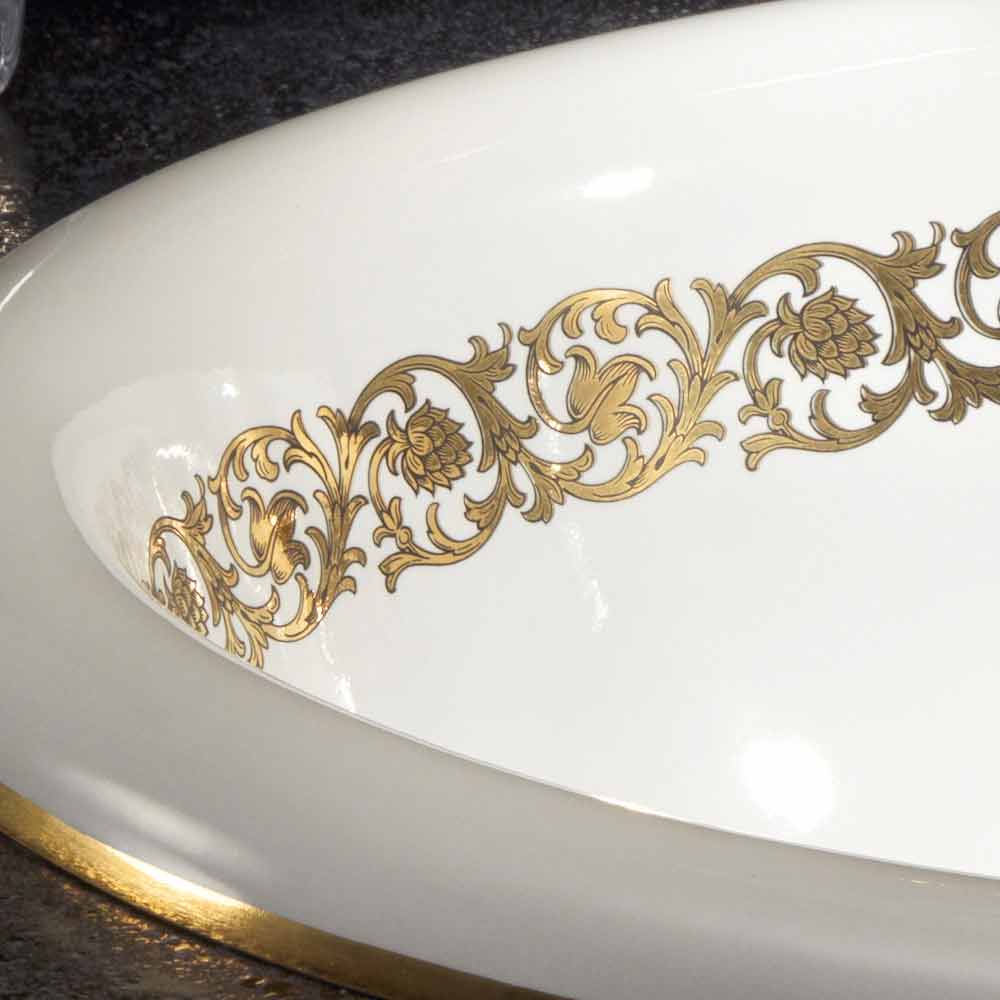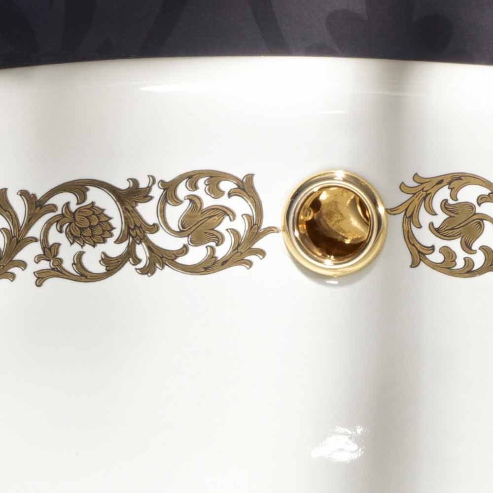 Banjë me dizajn barok, lavaman i integruar i bërë në Itali, Otis Lavaman i integruar i banjës i bërë në Itali në argjilë prej argjile, i bërë me dorë, i dekoruar, me shirit në kon pishe ari dhe buzë ari 24k.