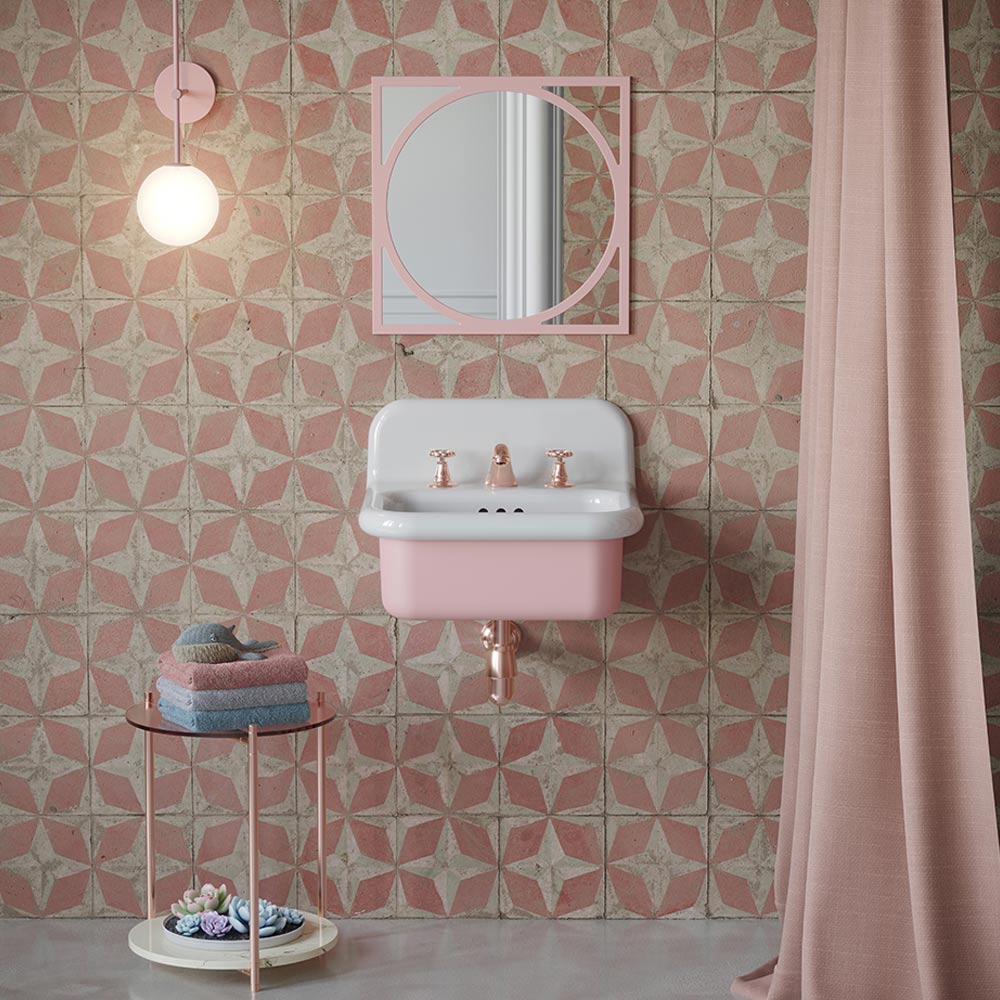 Lavaman banjoje me strukturë të varur në qeramikë dy-ngjyrëshe të bardhë dhe rozë karamele.