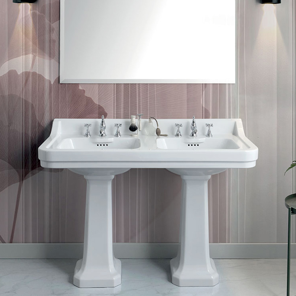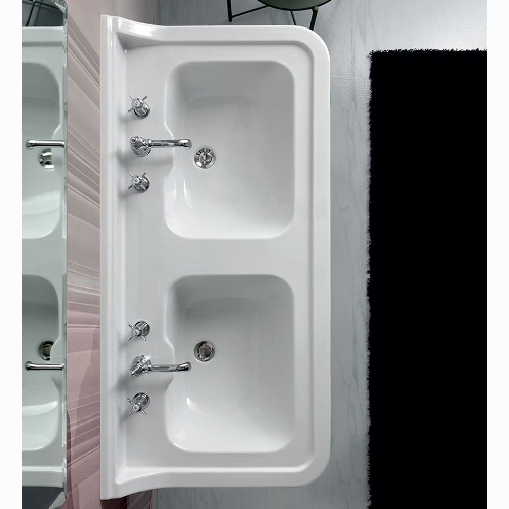 Lavaman konsol me legen të dyfishtë të bërë nga qeramika e bardhë me shkëlqim përmes një prodhimi artizanal 100% të prodhuar në Itali . Një mobilje që sjell në jetë modele klasike të dikurshme për të pajisur zona banjo po aq klasike me karakter, por edhe mjedise moderne në të cilat mund të luani në kontrastet origjinale dhe të pashembullta të stilit .