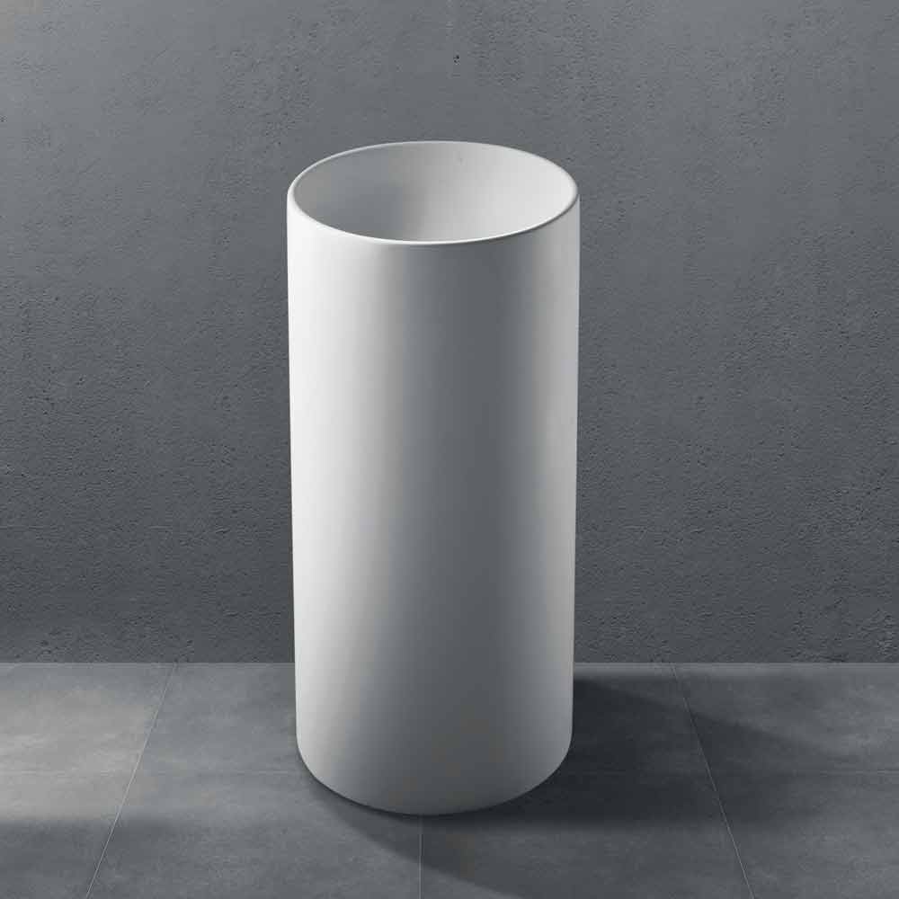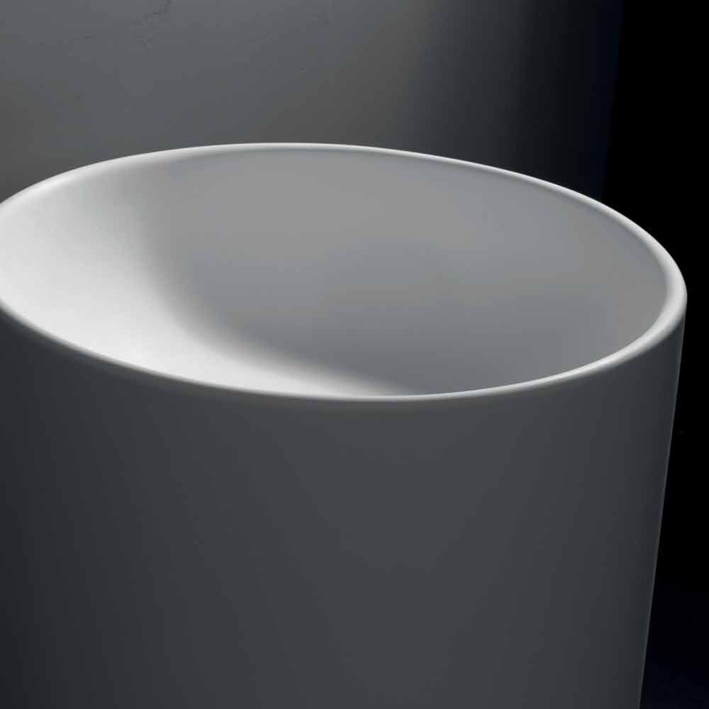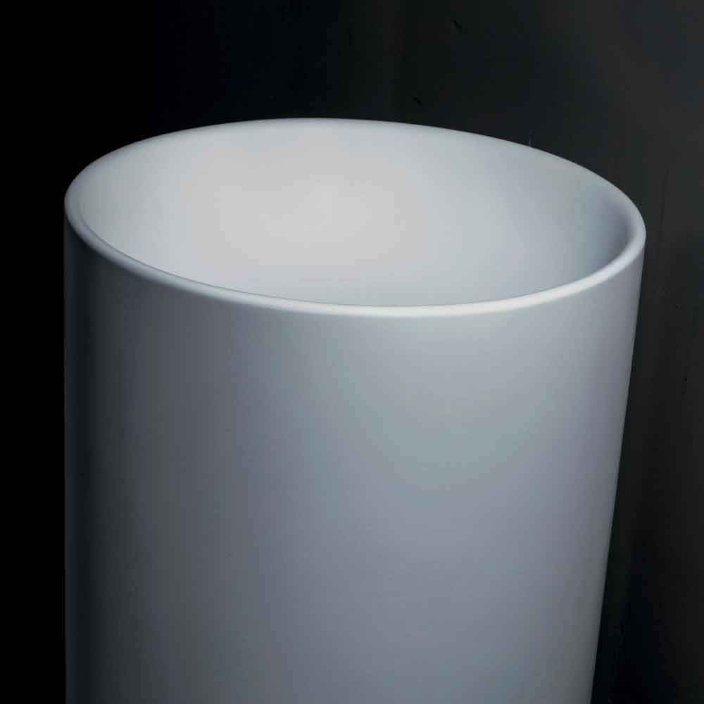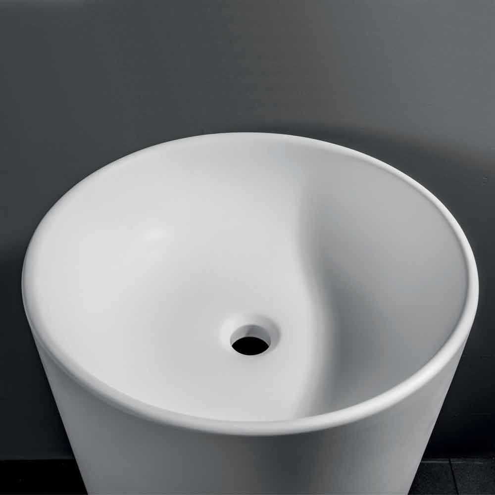 Lavaman nëkëmbë të lirë në një sipërfaqe të fortë Betracyl® të bardhë. Forma perfekte në pastërti absolute. Betracyl® është një material jashtëzakonisht me performancë të lartë që lejon krijimin e lavamanëve jo poroz, rezistent ndaj njollave dhe agjentëve agresivë.