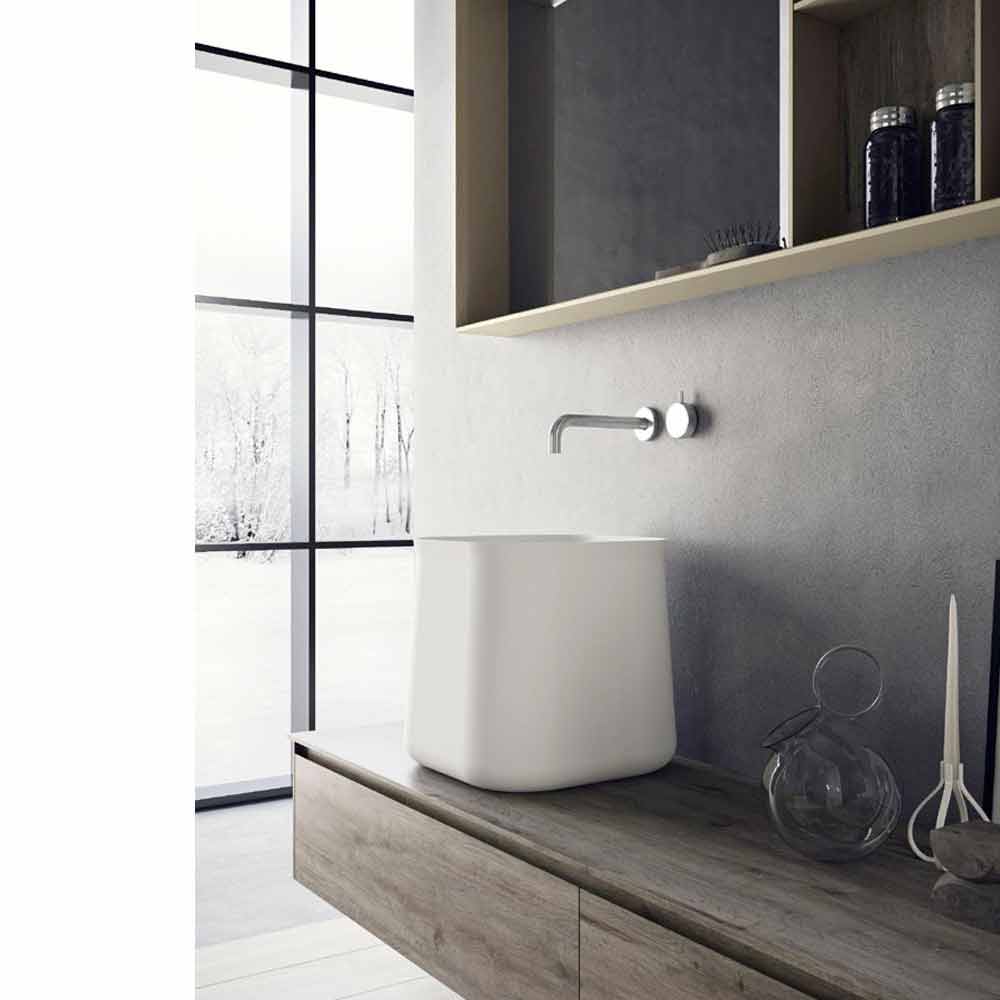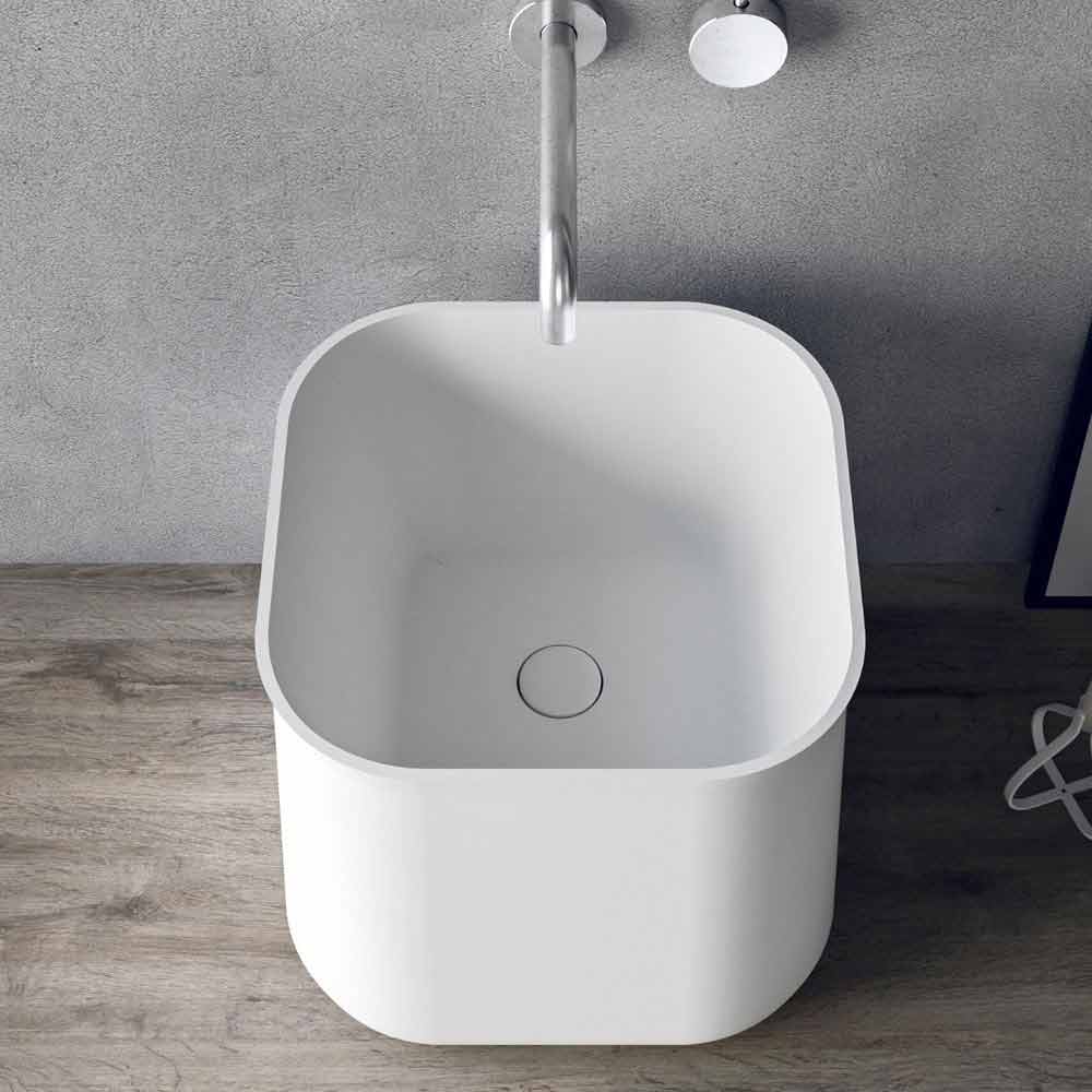 Lavaman countertop katror në rrëshirë të bardhë, dizajn modern me buzë të larta.