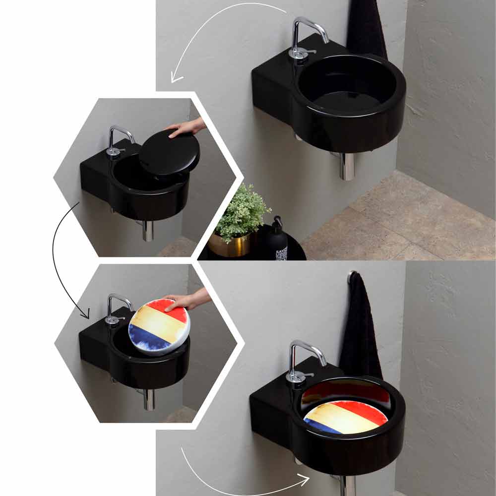Banak modern / lavaman i pezulluar i prodhuar në Itali Tor Tor është lavamani i thjeshtë me një dizajn të gjithanshëm i përshtatshëm për të gjitha shijet dhe nevojat estetike të dhomave falë përfundimeve të shumta të pjatës. Pllaka është e lëvizshme dhe është në dispozicion në përfundimet e mëposhtme: - E zezë; - me flamurin e Brazilit; - me flamurin e Kanadasë; - me flamurin e Zvicrës; - me flamurin e Gjermanisë; - me flamurin e Francës; - me flamurin e Italisë; - me flamurin e Norvegjisë; - me flamurin e Suedisë; - me flamurin e Mbretërisë së Bashkuar; - me flamurin e Shteteve të Bashkuara të Amerikës.