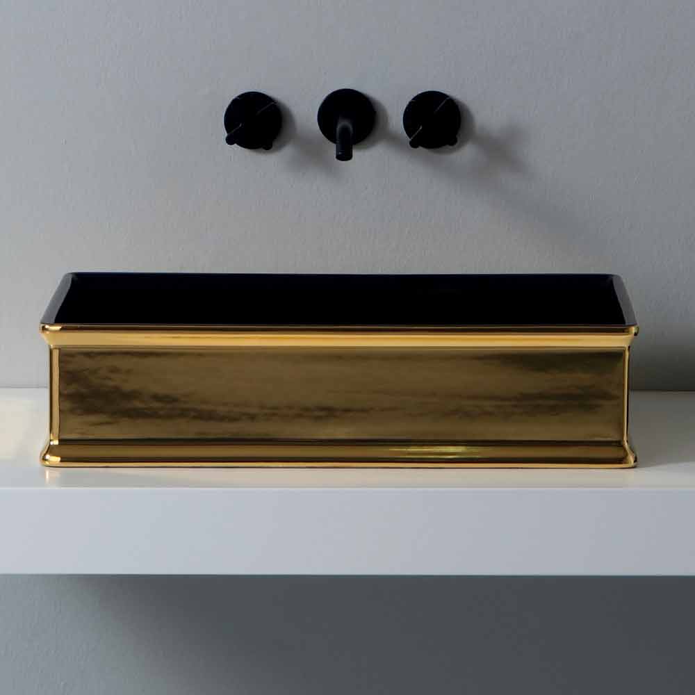 Lavaman banakje prej ari / qeramike të zezë të prodhuar në Itali Debora Debora është lavamani i tavolinës i bërë në Itali me dorë nga mjeshtrit mjeshtër; karakterizohet nga një strukturë qeramike me një përfundim me dy ngjyra: ari dhe e zezë. Pavarësisht nga dy ngjyrat kaq të ndritshme, ai përmban një përsosje ekstreme dhe një dizajn modern të përsosur për të mobiluar çdo stil të çdo banjo.