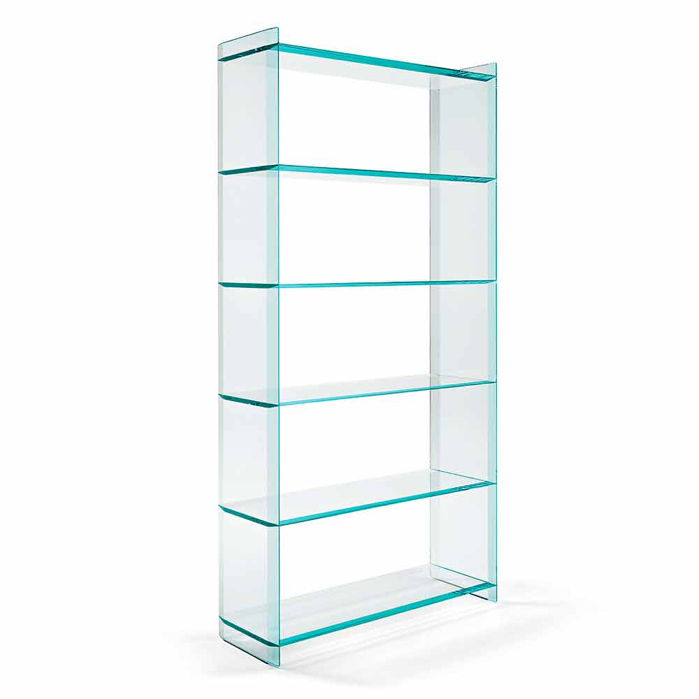 Kjo raft librash për dhomën e ndenjes karakterizohet nga dizajni i saj intrigues dhe elegant i bërë tërësisht prej xhami ekstra të pastër me pjerrësi 5 cm.