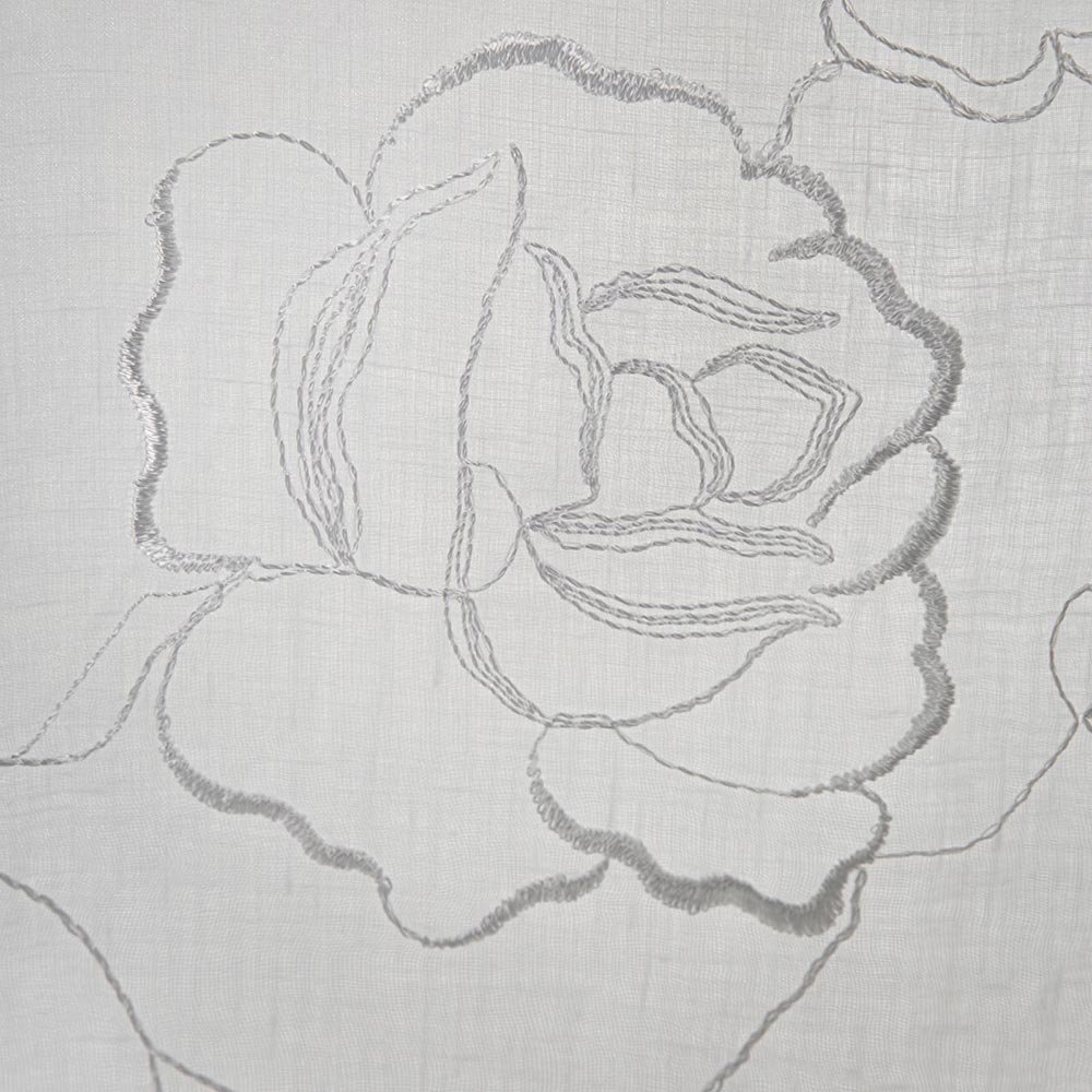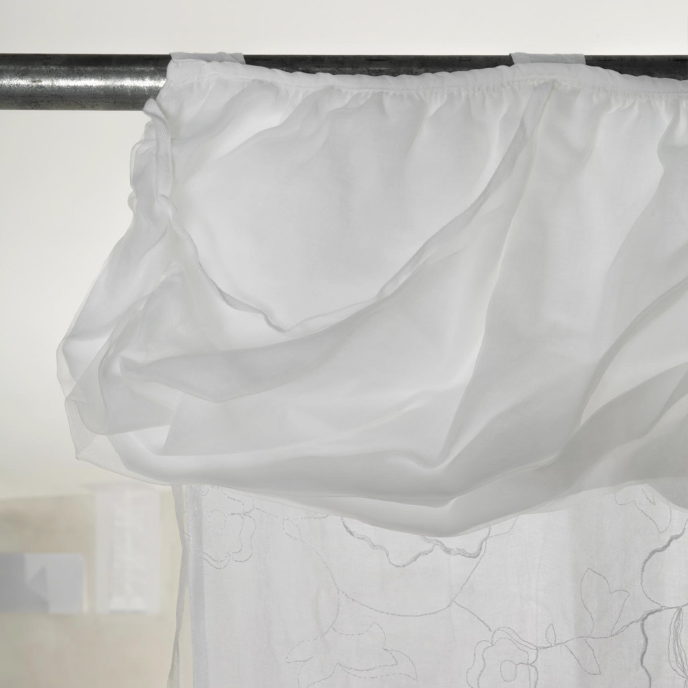 perde të bardhë në garzë prej liri dhe organza me trëndafila të qëndisur dhe pëlhurë të mbështjellë së bashku me unaza për shufër.