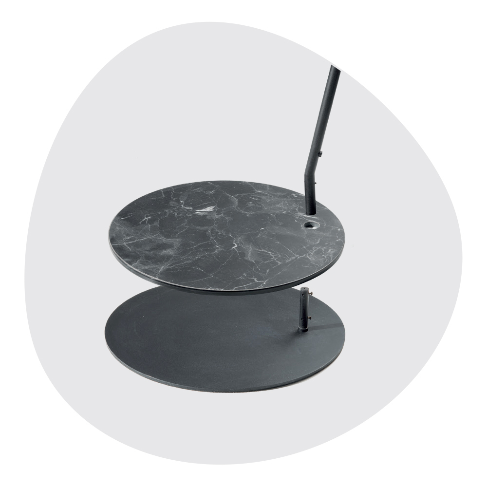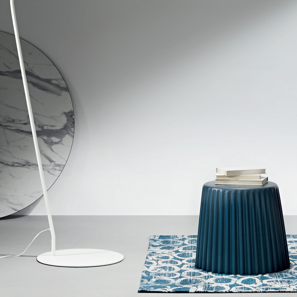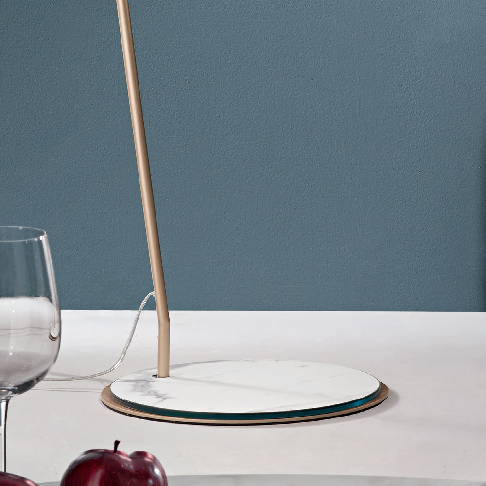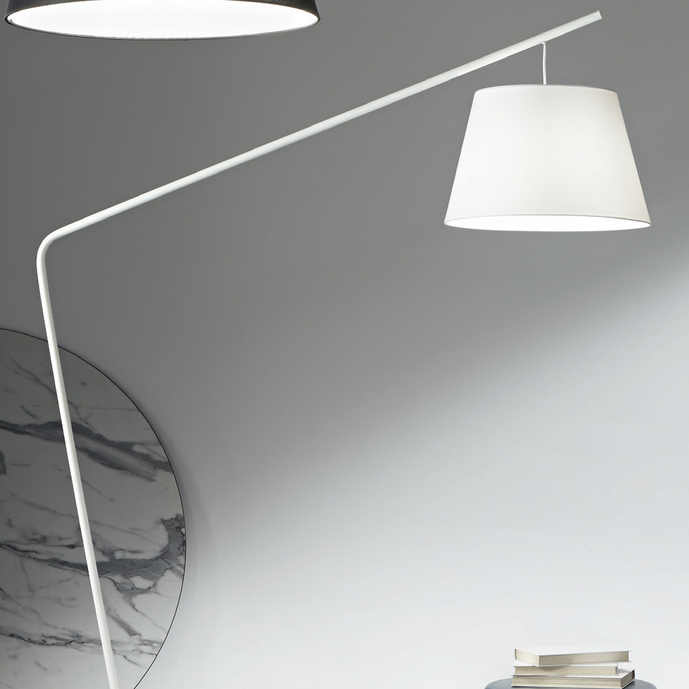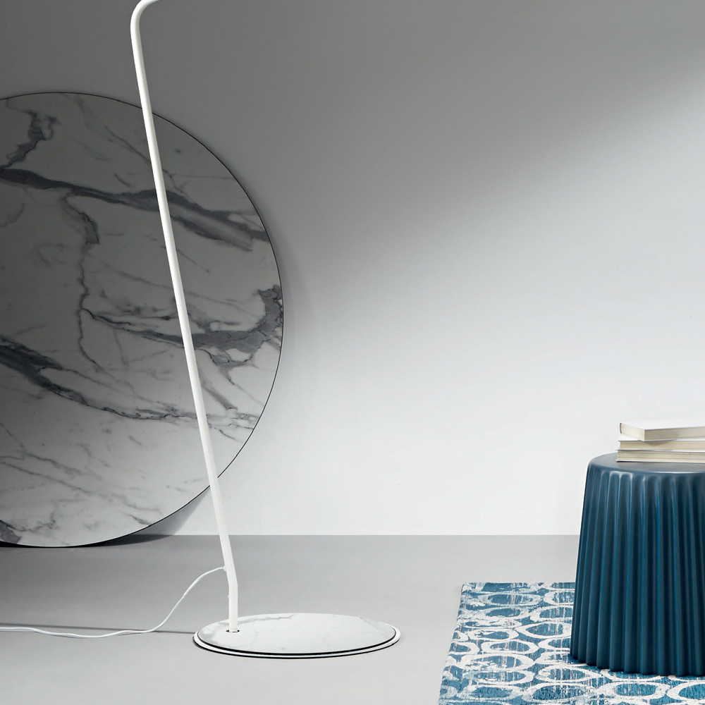 Llambë moderne dyshemeje me strukturë metalike dhe abazhur pvc të mbuluar me pëlhurë . Një mobilje që është ideale për të arreduar zonën tuaj të jetesës në mënyrë të matur dhe elegante nëpërmjet një produkti shumë funksional, i aftë për të ofruar ndriçim optimal së bashku me një prekje të stilit unik . Për të rritur vlerën e anës së tij estetike është aftësia për të personalizuar bazën përmes përdorimit të një mbulese me efekt mermeri që i jep akoma më shumë personalitet dhe karakter pamjes përfundimtare të produktit.