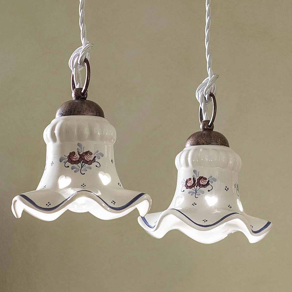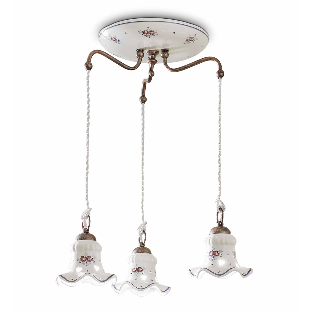 Llamba varëse e rrumbullakët 3 drita në hekur dhe qeramike e dekoruar me dorë, prodhim italian nga Ferroluce.