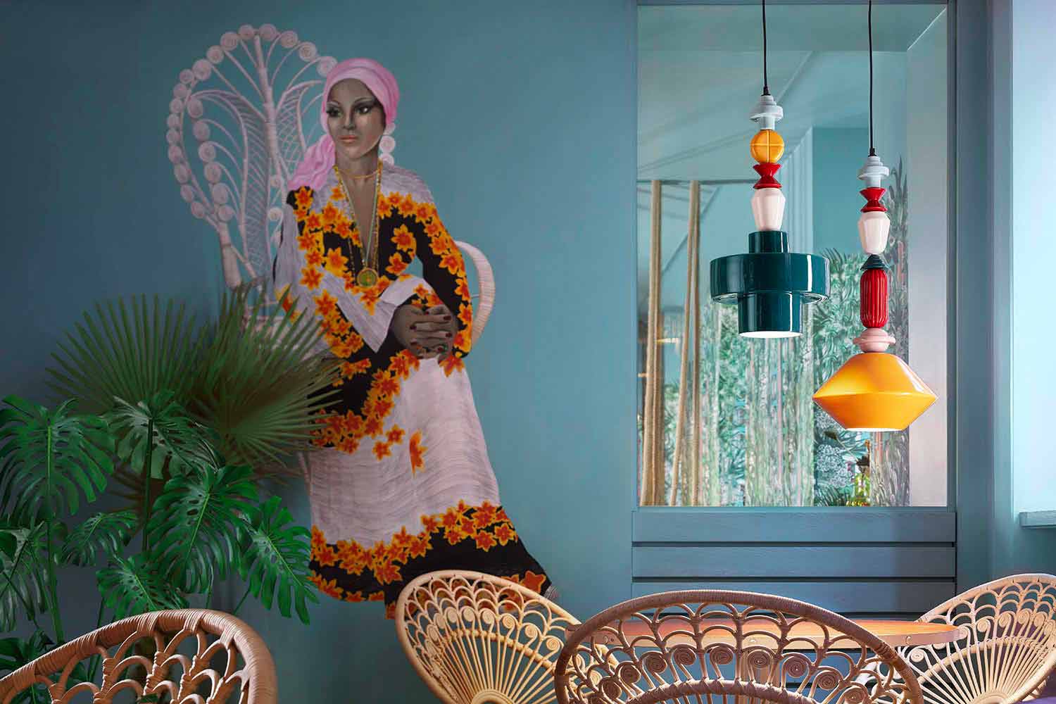 Lariat është zbukuruar me elemente qeramike shumëngjyrësh që ndjekin njëri-tjetrin vertikalisht deri në difuzorin qendror gjeometrik.