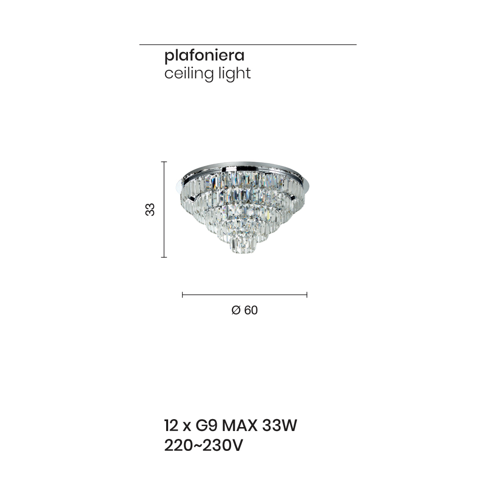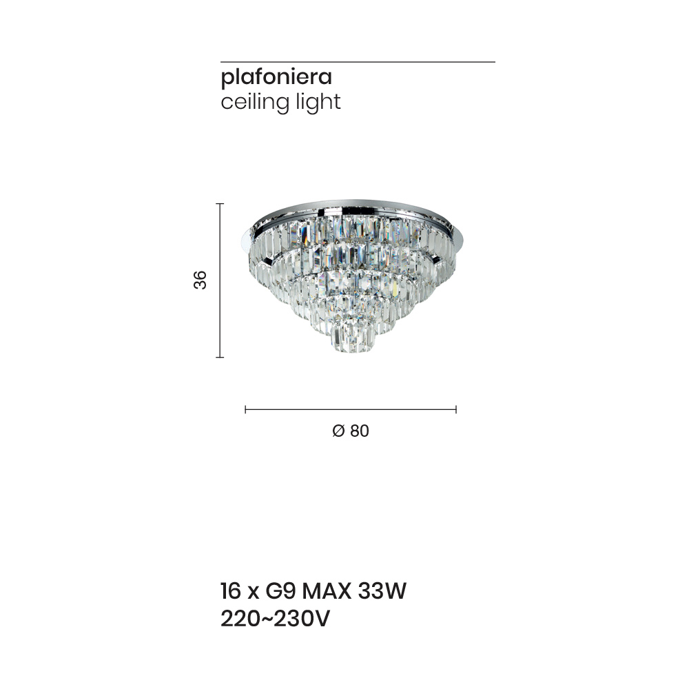 Ai përbëhet nga një strukturë metalike argjendi dhe varëse kristali që dekorojnë, duke ndriçuar çdo ambient me shije dhe karakter, në një përzierje stili, klasi dhe inovacioni.