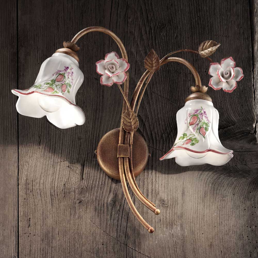Llamba muri me 2 drita metalike dhe qeramike me trëndafila të lyer me dorë të prodhuara në Itali nga Ferroluce.