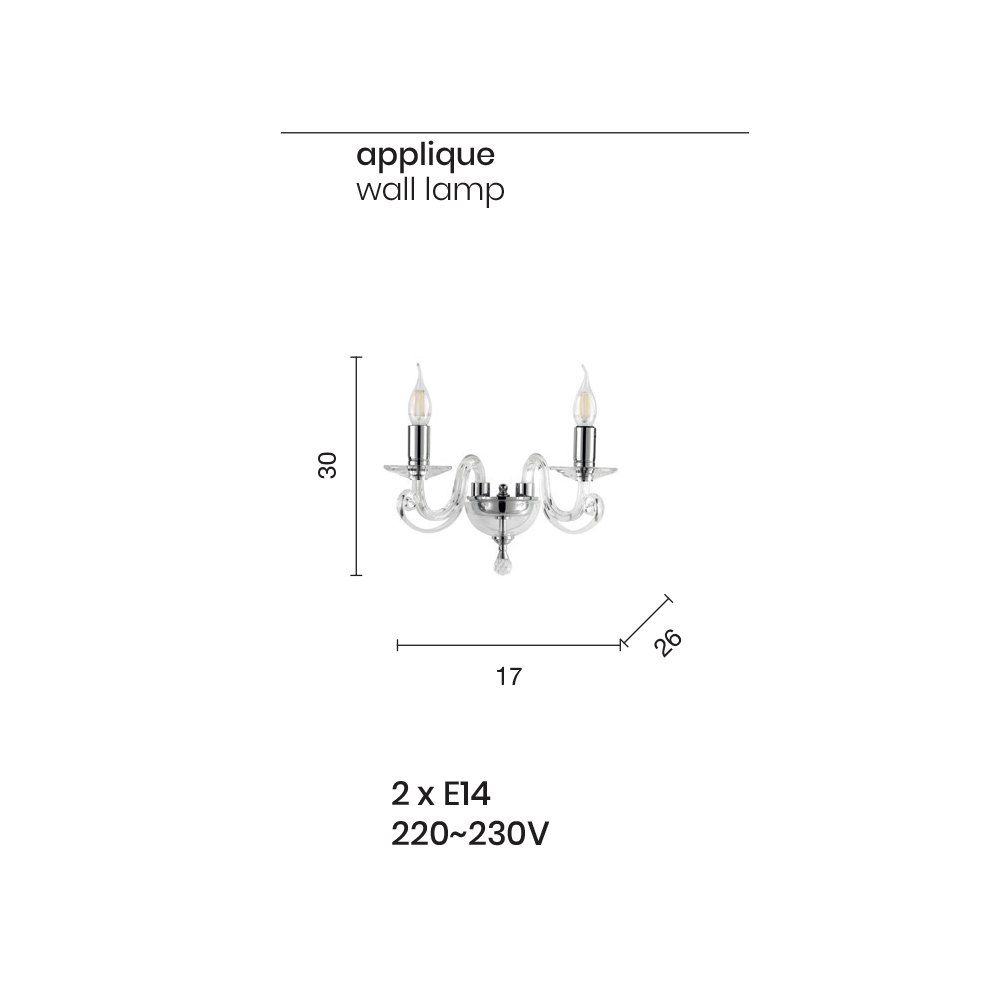 E bërë nga qelqi i punuar me dorë dhe kristali optik me materiale të cilësisë së lartë dhe vëmendje të veçantë ndaj detajeve , llamba murale do të bëhet protagonisti i ambientit në të cilin do të vendoset, zbukuruar nga varëse e rrumbullakët në kristal optik dhe nga detajet në krom . metal .