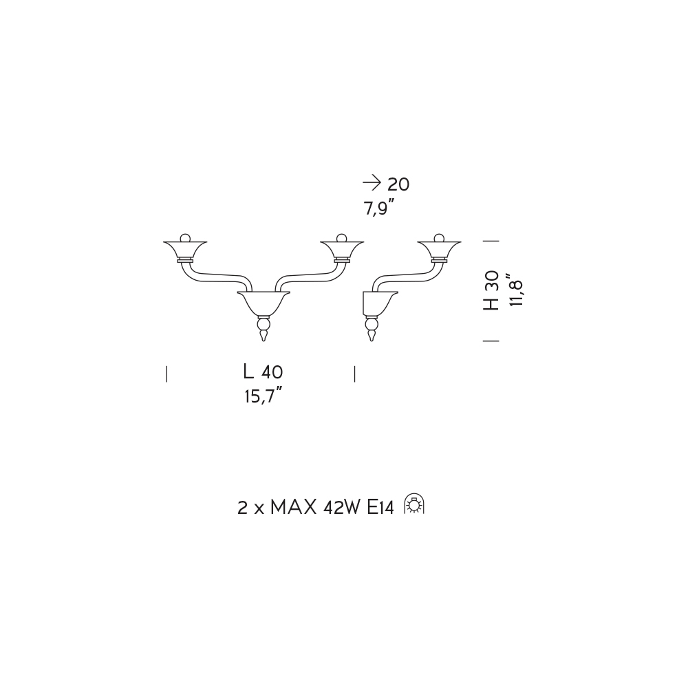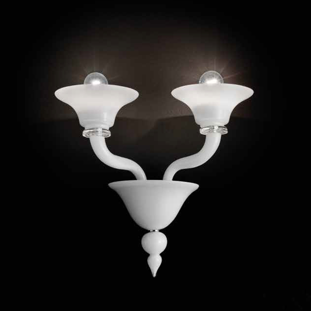 Llambë muri 2-drite e prodhuar në Itali në qelq Venecias me finiturë të bardhë qumështi - kristal i punuar me dorë me detaje metalike në fund të kromit të lëmuar . Një takim i paprecedentë midis linjave historike dhe dizajnit bashkëkohor për t'i dhënë jetë një mobiljeje me hijeshi dhe elegancë të përjetshme. Estetika e tij karakterizohet nga një vëllim i artikuluar që bëhet dinamik dhe i lehtë përmes dridhjeve të ndritshme të sipërfaqeve të mrekullueshme të xhamit të fryrë që alternojnë krahët transparentë elegantë me kupat e bëra me teknikën e veshjes . Për të nënvizuar vlerën e tij është vëmendja ndaj detajeve që del nga përbërësit metalikë të kromuar të cilët lejojnë që produkti të përshtatet me shijet dhe situatat e ndryshme të përdorimit.