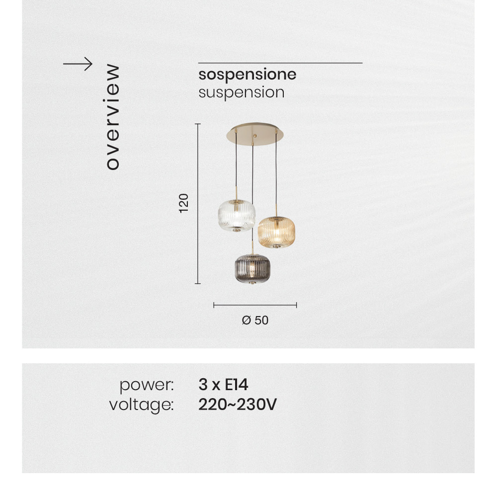 Llambë pezullimi me strukturë metalike ngjyrë aridhe tre difuzorë xhami me ngjyrë me vija. Një dizajn i shoqëruar nga forma elegante dhe të rafinuara që i japin dhomës një shije klas, duke pasuruar estetikën e saj falë një prekjeje ekskluzive dhe një estetike të rafinuar dhe novatore . Tre ngjyrat e mrekullueshme që nënvizojnë elegancën e përjetshme të xhamit të fryrë i japin pamjes përfundimtare të produktit thelbin evërtetë delikat dhe personalitetin e tij të fortë bashkëkohor, duke i dhënë kështu jetë një zgjidhjeje arredimi sa funksionale aq edhe estetike mbresëlënëse dhe me një karakter të fortë. ndikimi vizual. .