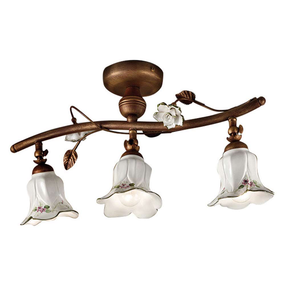 Llambë tavani lineare 3 drita në metal dhe qeramikë me trëndafila të lyer me dorë, prodhim Itali nga Ferroluce.