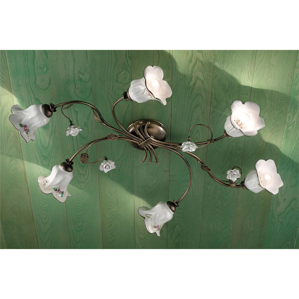 Llambë tavani me 6 lumen në metal dhe qeramikë me trëndafila të lyer me dorë të prodhuara në Itali nga Ferroluce.