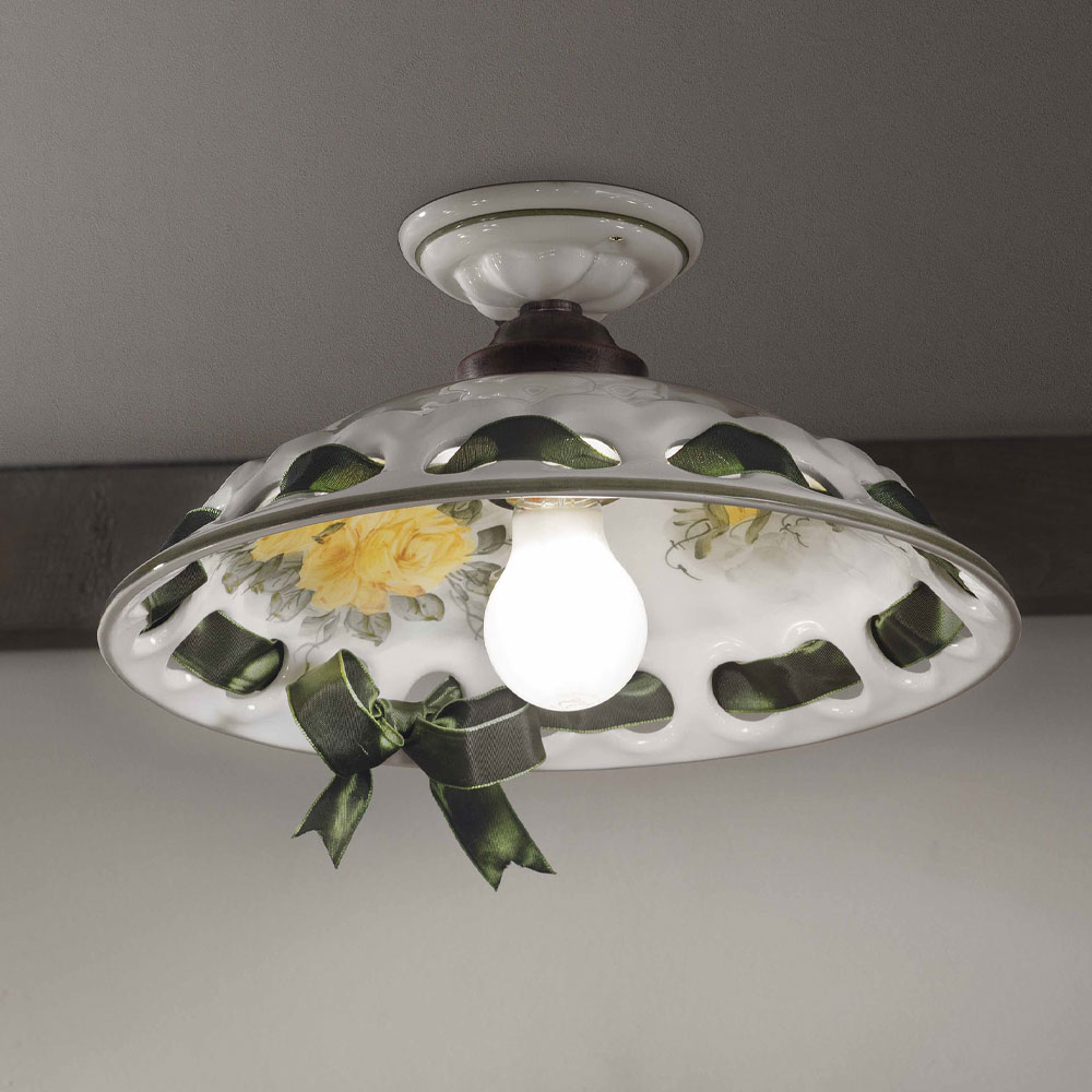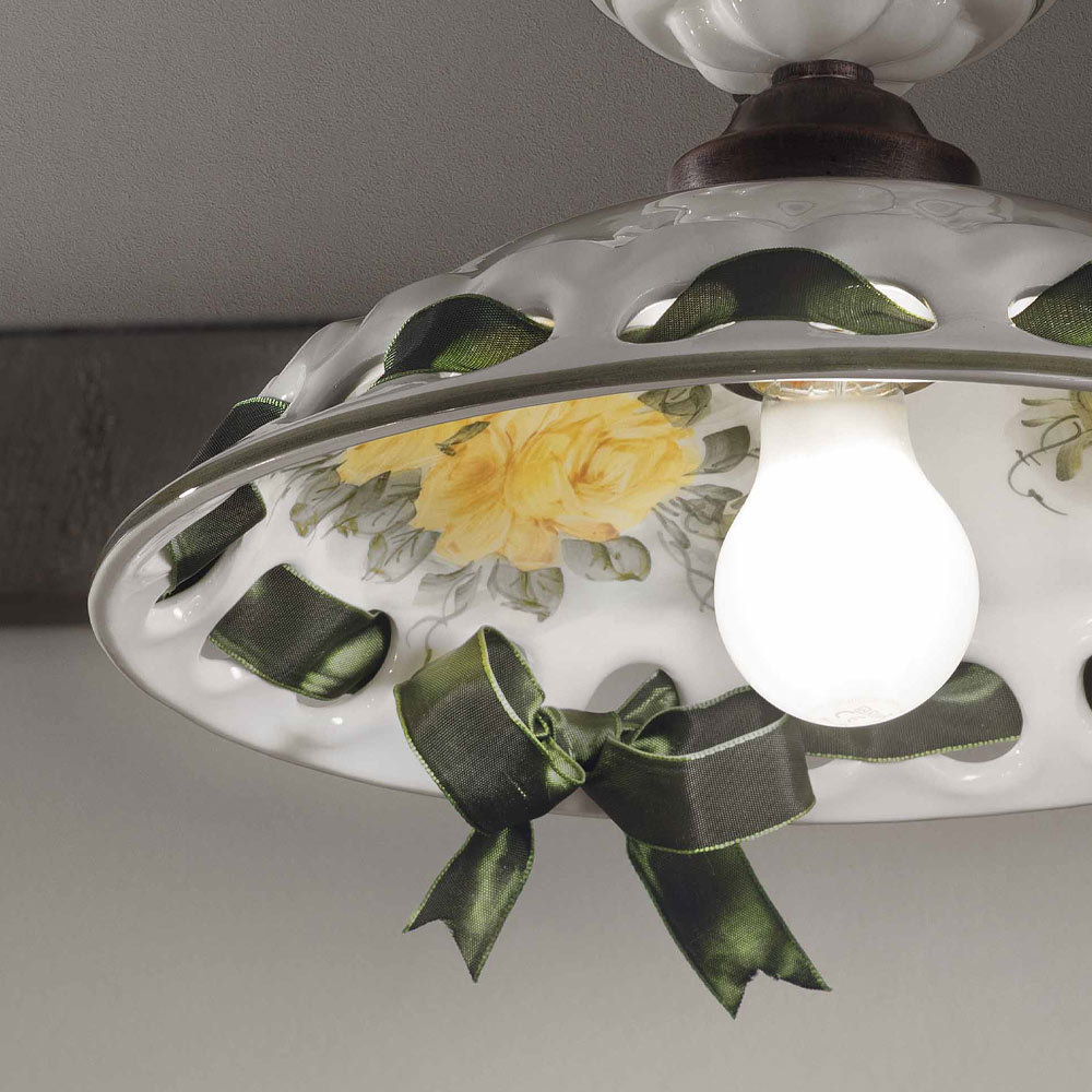 Kjo llambë tavani është tërësisht prej metali dhe qeramike e lyer me dorë me dekorime me lule që nxjerrin në pah mjeshtërinë dhe shkathtësinë e mjeshtrit.
