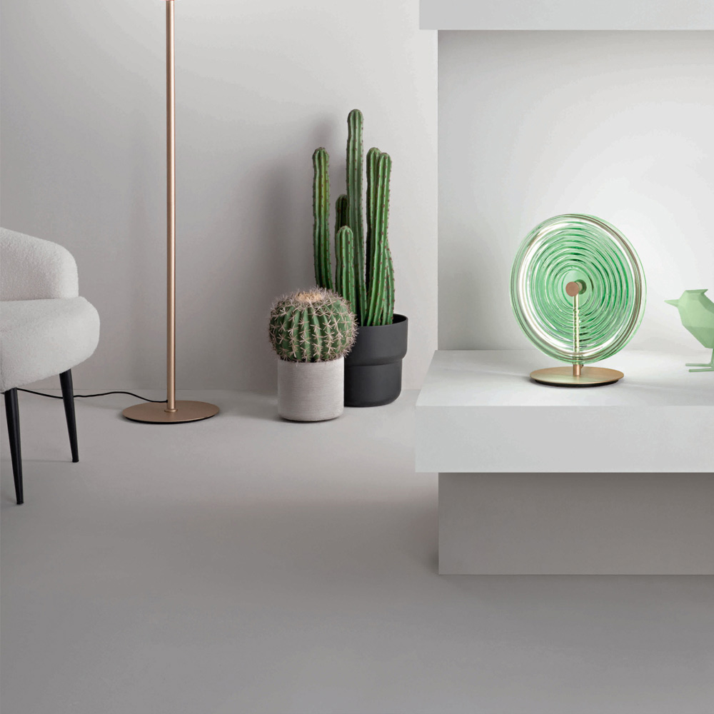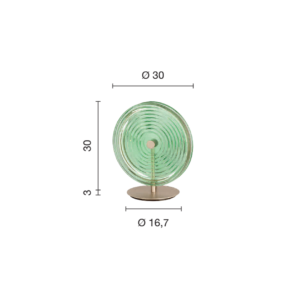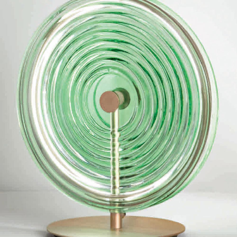 Llambë tavoline tërësisht e prodhuar në Itali e punuar me metal të lyer me ar,xhami e zbukuruar me vija koncentrike jeshile me dritë LED . Ky produkt synon të përmirësojë traditën përmes një qasjeje bashkëkohore ku stili, klasi dhe inovacioni bashkohen për të krijuar formula të reja dizajni për të mobiluar dhe ndriçuar çdo ambient me shije dhe karakter. Pikat e forta janë veçantia e formave , cilësia e materialeve dhe veçantia e burimit të dritës .