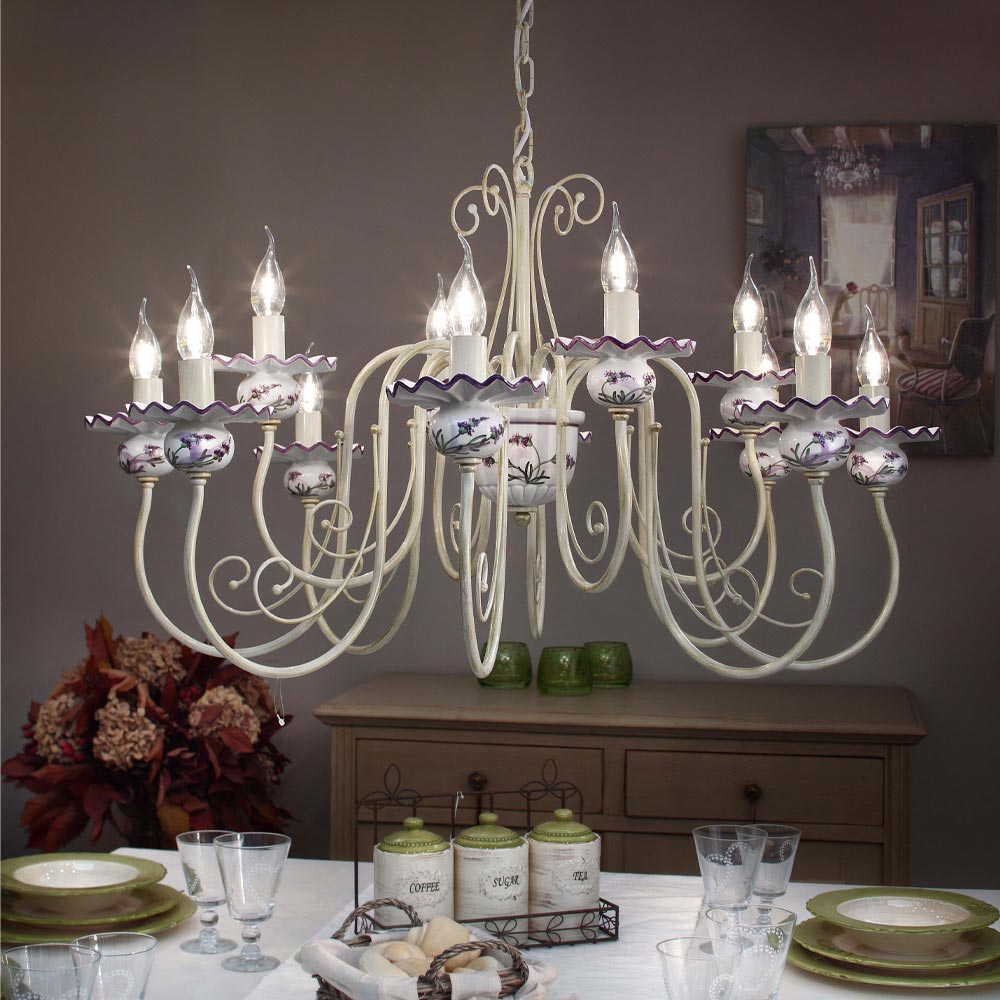 Ky llambadar 12 dritash është tërësisht i punuar me dorë në bronz dhe qeramikë antike me dekorime lulesh të pikturuara me dorë ,për të nxjerrë në pah aftësitë dhe aftësitë manuale të artizanëve. Dizajni karakterizohet nga referenca në të kaluarën, kur ndriçimi i dhomave i besohej dritës së zbehtë të qirinjve.