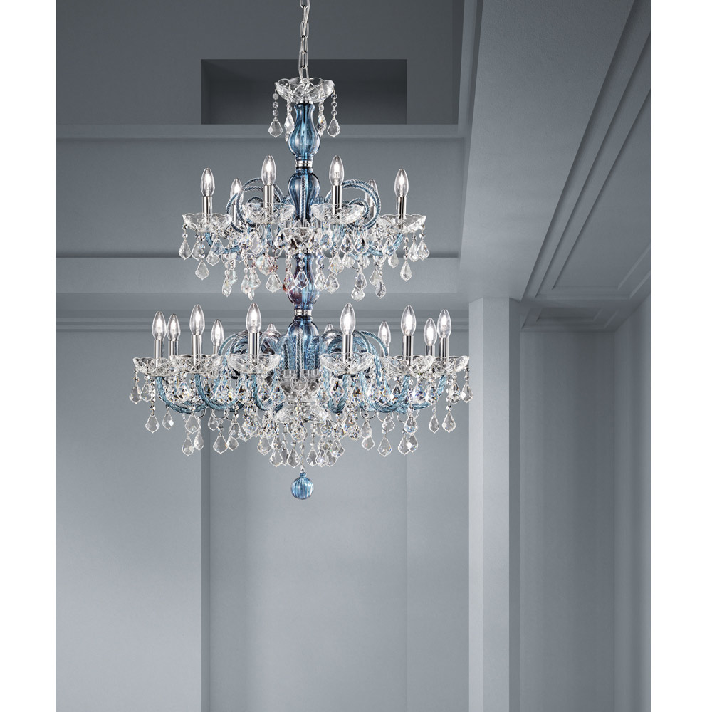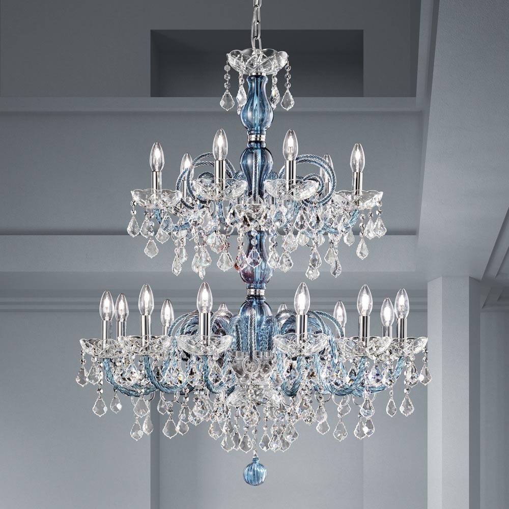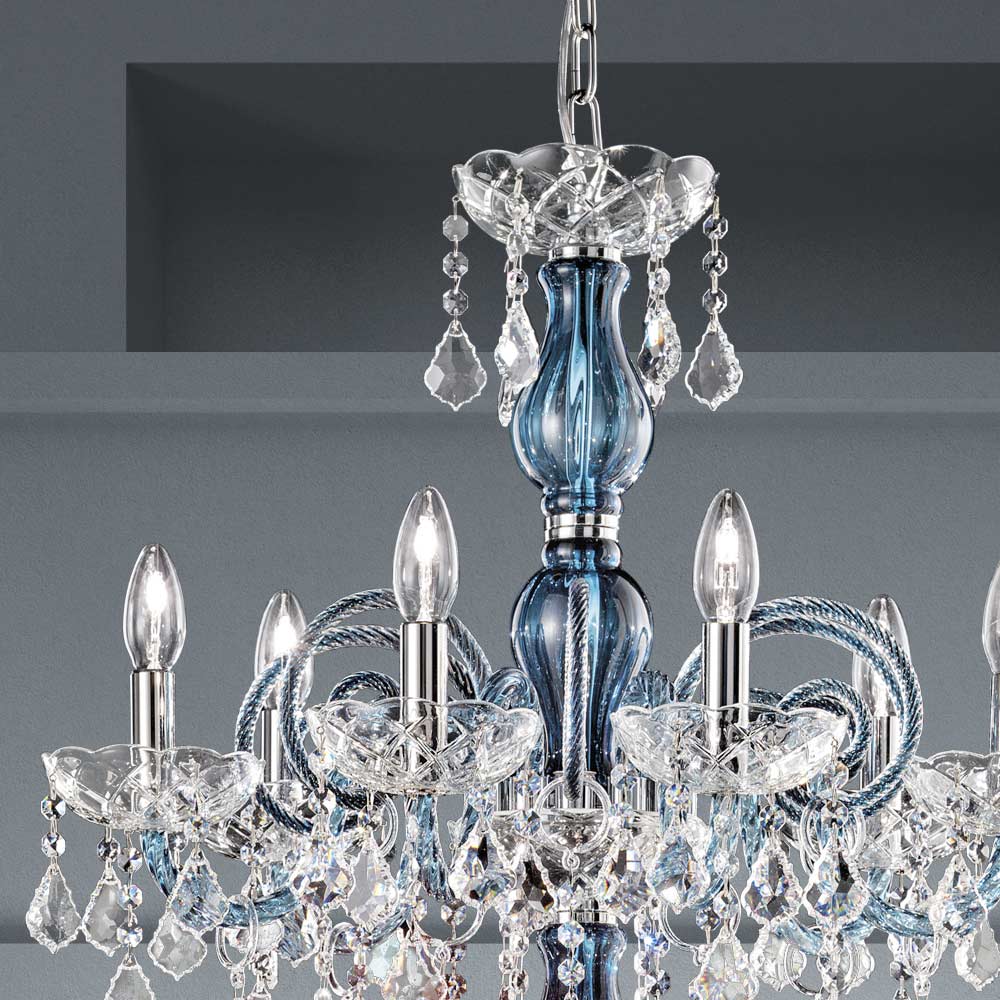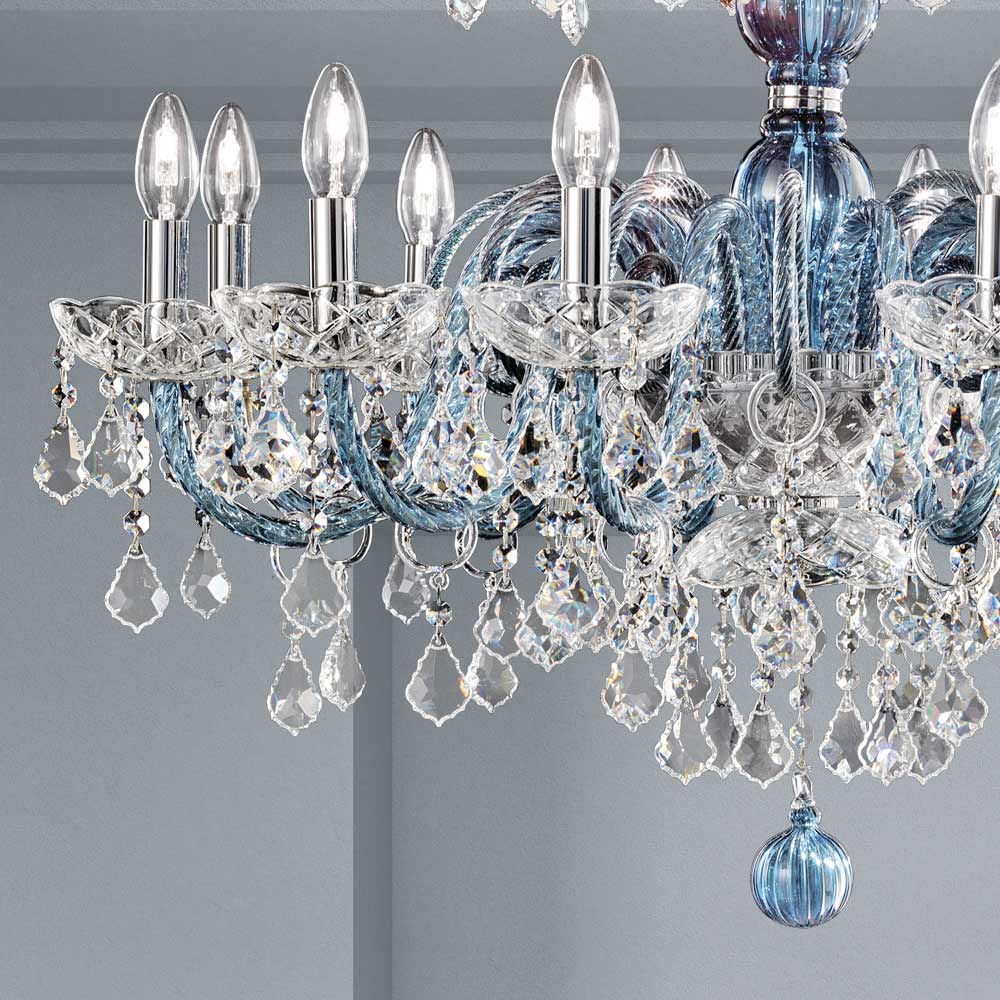 Llambadar 18 dritashprej xhami Venecias në fund xhins me varëse plumbi dhe metal të kromuar të lëmuar . E bërë me mjeshtëri , ky komplement karakterizohet nga krahët e mrekullueshëm të punuar me dorë nëpërmjet teknikës së përdredhjes, e cila krijon një rezultat ekskluziv që të kujton estetikisht gërshetim të një litari, duke i dhënë personalitet llambadarit. Një shi i vërtetë drite pushton strukturën e llambadarit dhe më pas përhapet në mjedisin përreth me anë të përthyerjes përmes magjisë së temave dhe varëseve kristali me përfundime të shkëlqyera, duke krijuar kështu një efekt skenografik ndjellës dhe ëndërrimtar, i aftë për të magjepsur dhe befasuar. për elegancën dhe madhështinë e saj.