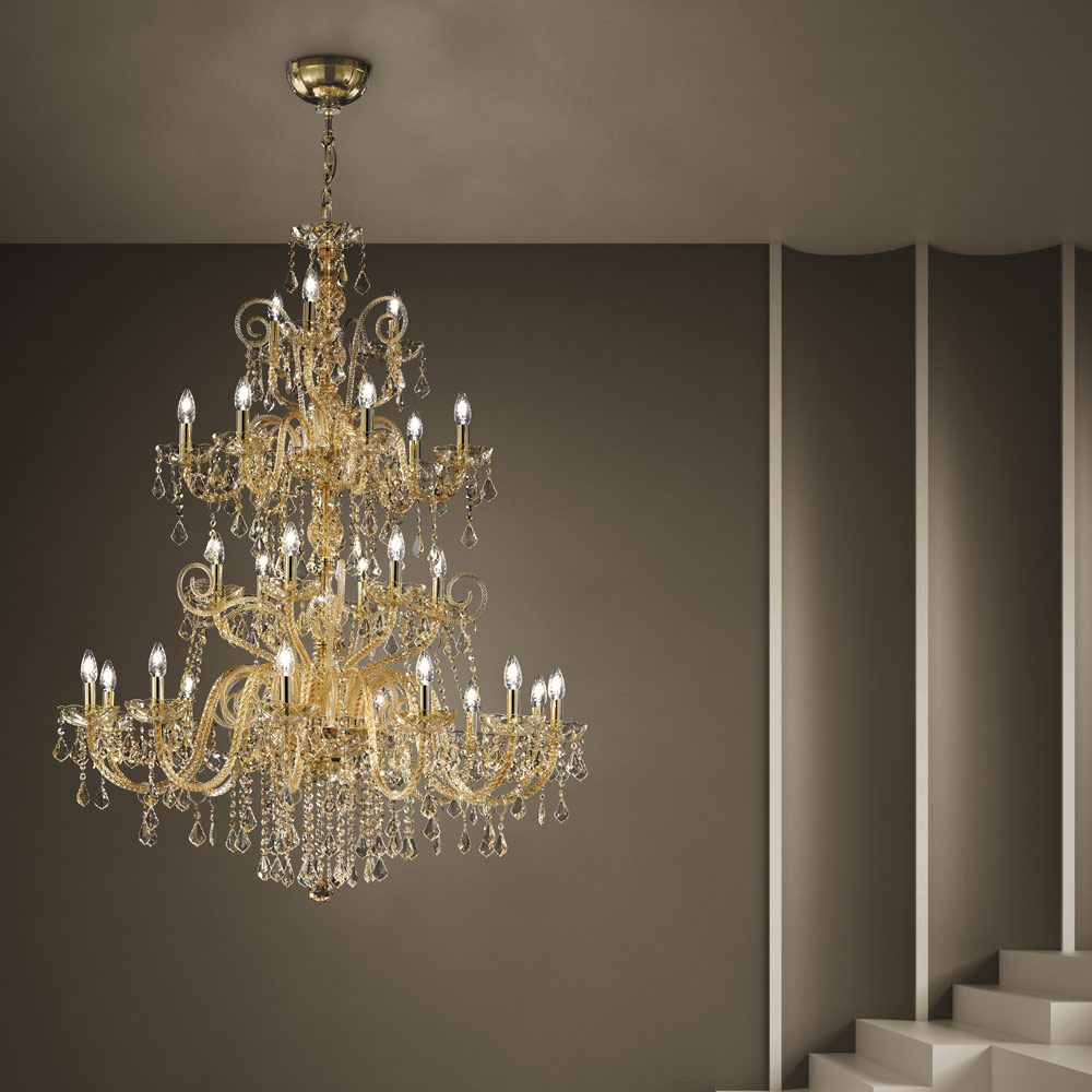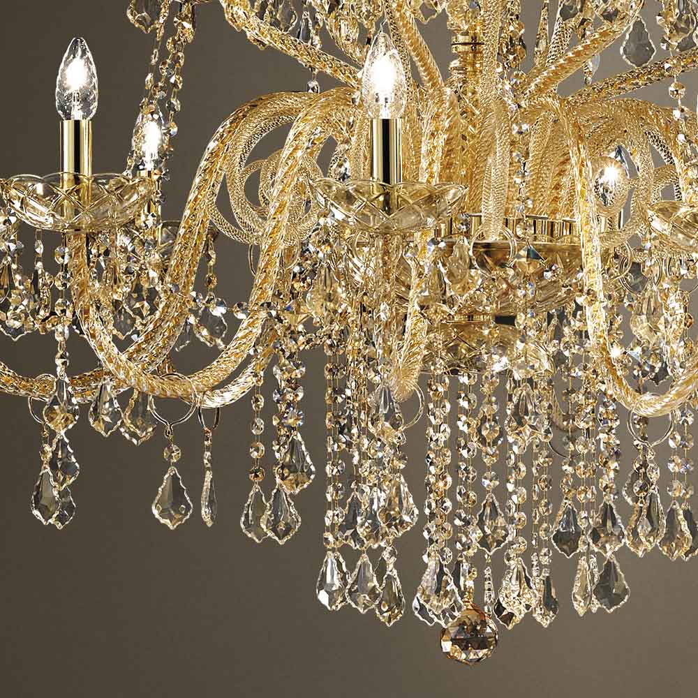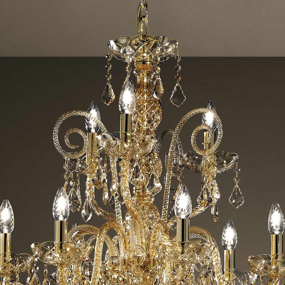 Llambadar me 27 dritaprej xhami Venecias me dekorim Amber me varëse kombëtaredhe detaje në metal të artë me shkëlqim . E bërë me mjeshtëri , ky komplement karakterizohet nga krahët e mrekullueshëm të punuar me dorë nëpërmjet teknikës së përdredhjes, e cila krijon një rezultat ekskluziv që të kujton estetikisht gërshetim të një litari, duke i dhënë personalitet llambadarit. Një shi i vërtetë drite pushton strukturën e llambadarit dhe më pas përhapet në mjedisin përreth me anë të përthyerjes përmes magjisë së temave dhe varëseve kristali me përfundime të shkëlqyera, duke krijuar kështu një efekt skenografik ndjellës dhe ëndërrimtar, i aftë për të magjepsur dhe befasuar. për elegancën dhe madhështinë e saj.