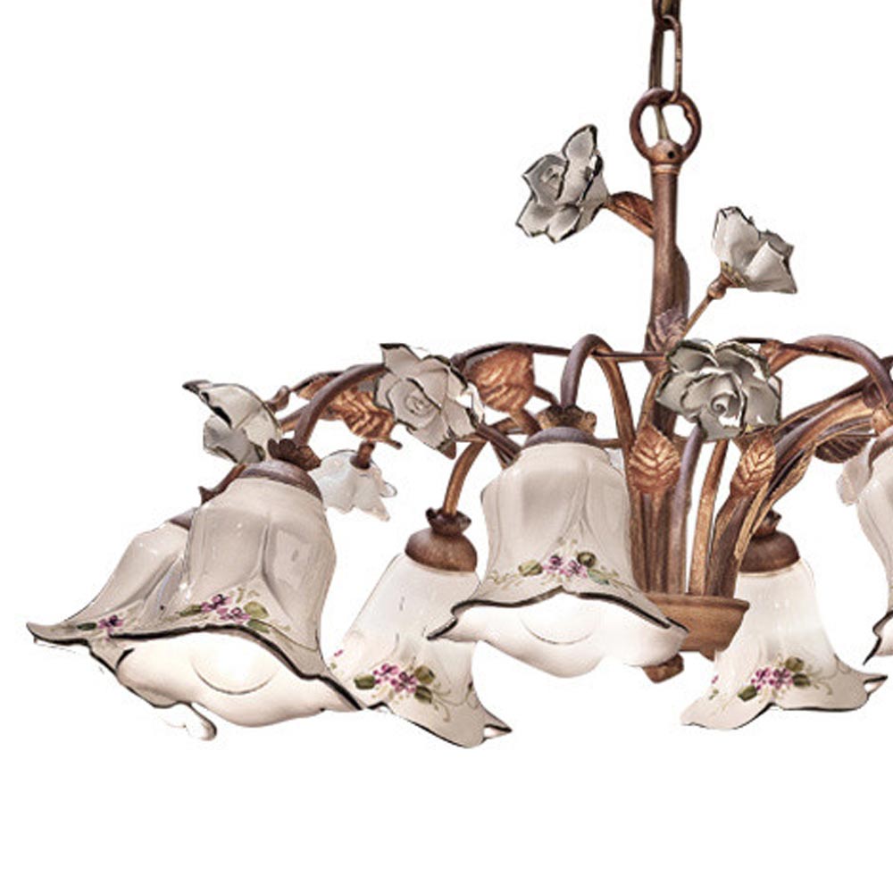 Llambadar me 8 drita metalike dhe qeramike me trëndafila të lyer me dorë të prodhuar në Itali nga Ferroluce.
