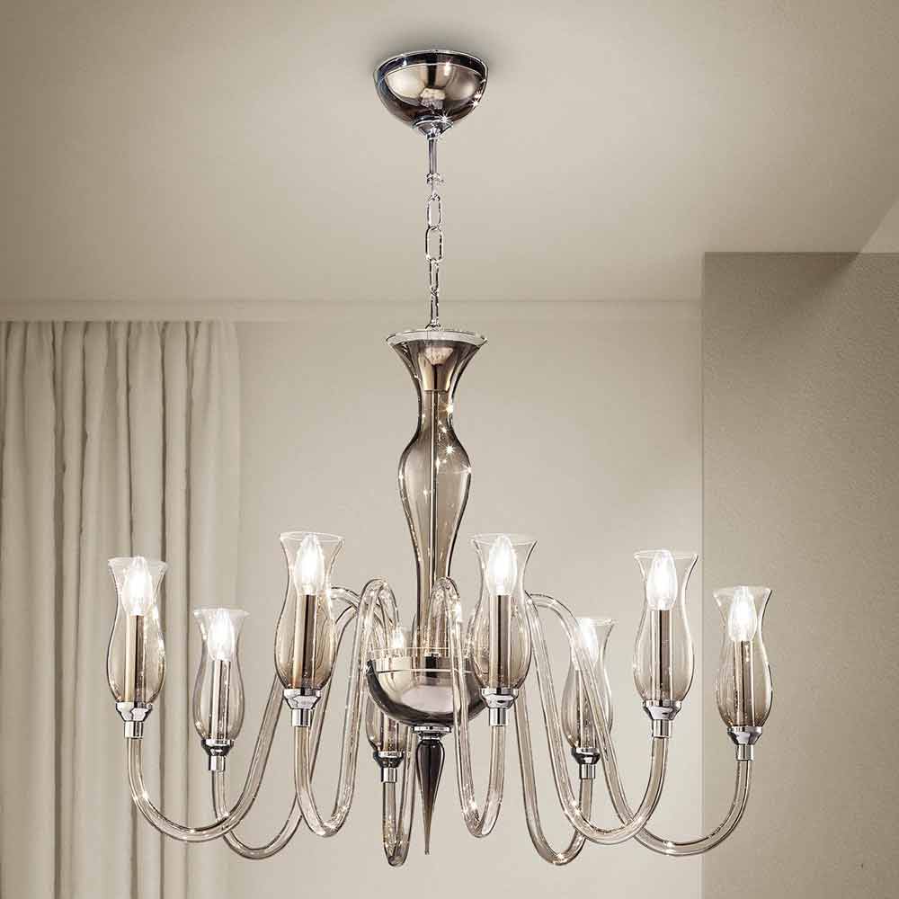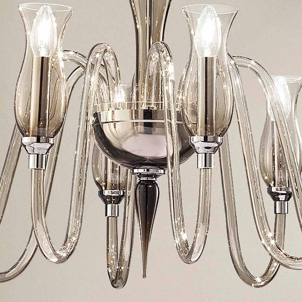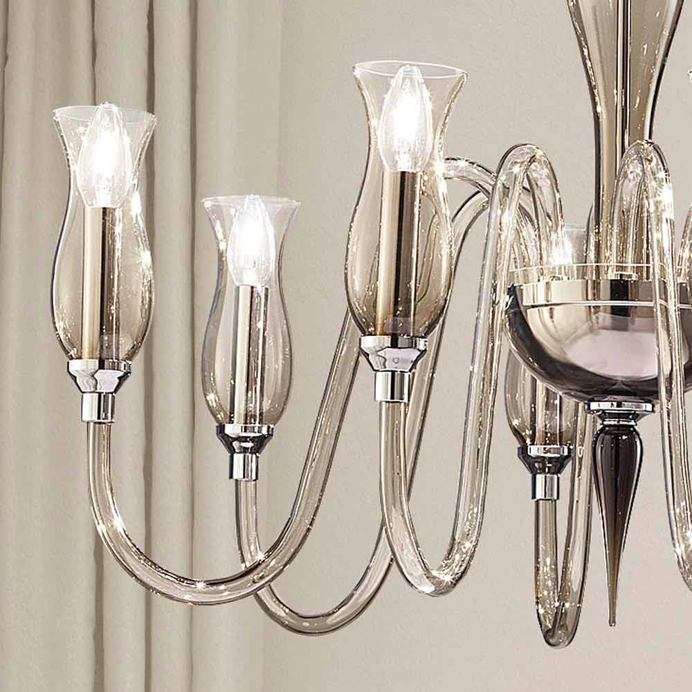 Llambadar i rafinuar me 8 drita nëgotë Venecia të punuar me dorë në fund të tymosur me detaje në metal të kromuar të lëmuar , të punuar me dorë në Itali. Madhështia që nënvizon format e saj e bën atë protagonist të skenës, ideal për t'u vendosur në qendër të dhomës, në një dhomë të gjallë ose në një dhomë gjumi të madhe me klas për atmosferë sugjestionuese dhe romantike. Veçantia e saj përfaqësohet nga sipërfaqja e lëmuar e xhamit që nxjerr në pah lojën e transparencës dhe efektet e mrekullueshme të gjalla të dritës për një rezultat me një ndikim të fortë vizual.