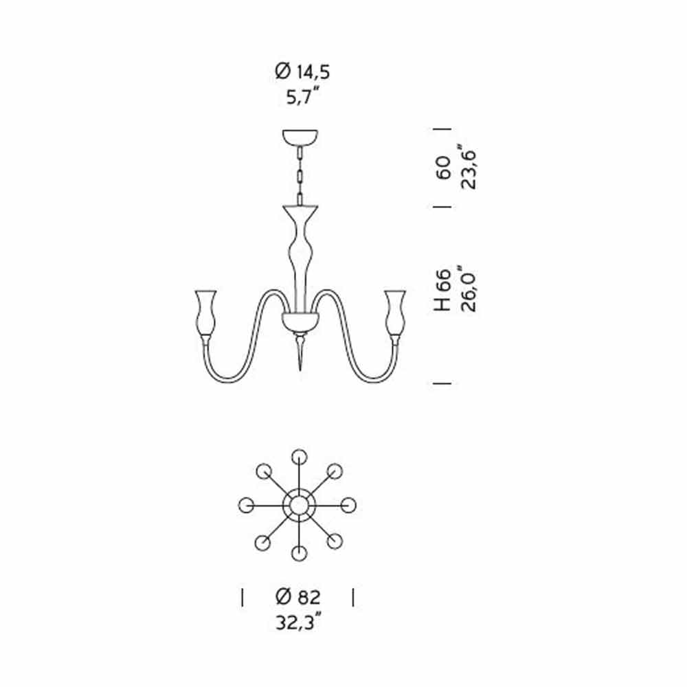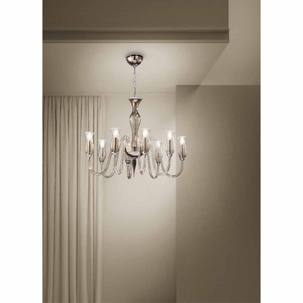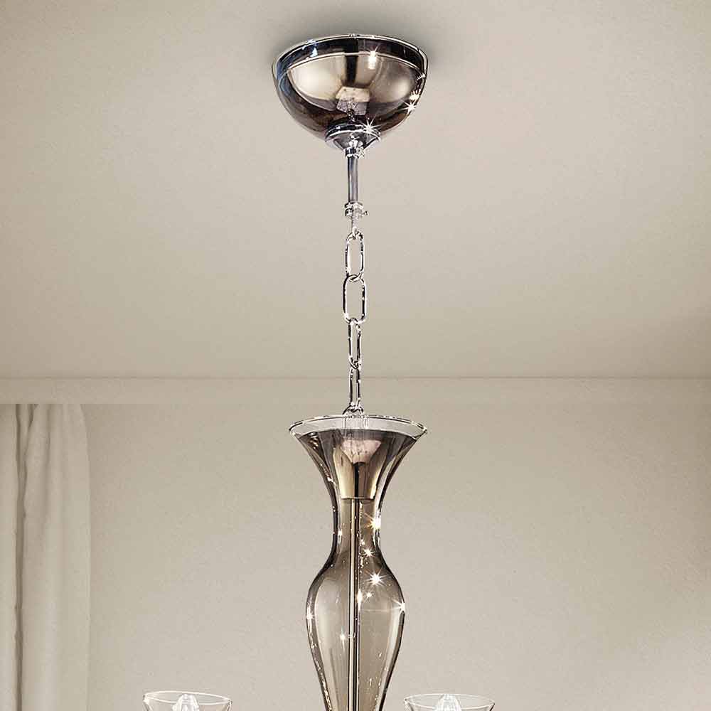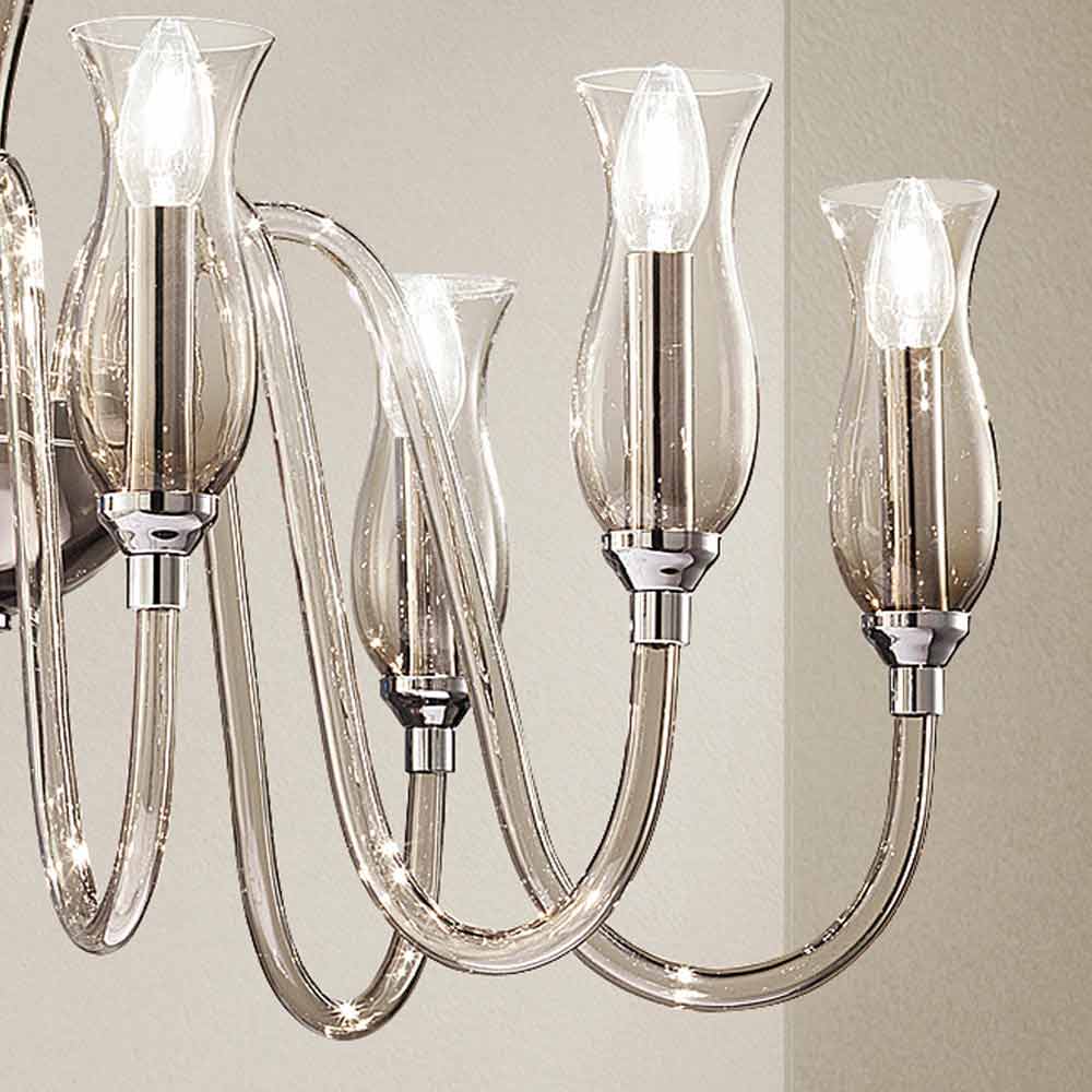 Llambadar i rafinuar me 8 drita nëgotë Venecia të punuar me dorë në fund të tymosur me detaje në metal të kromuar të lëmuar , të punuar me dorë në Itali. Madhështia që nënvizon format e saj e bën atë protagonist të skenës, ideal për t'u vendosur në qendër të dhomës, në një dhomë të gjallë ose në një dhomë gjumi të madhe me klas për atmosferë sugjestionuese dhe romantike. Veçantia e saj përfaqësohet nga sipërfaqja e lëmuar e xhamit që nxjerr në pah lojën e transparencës dhe efektet e mrekullueshme të gjalla të dritës për një rezultat me një ndikim të fortë vizual.