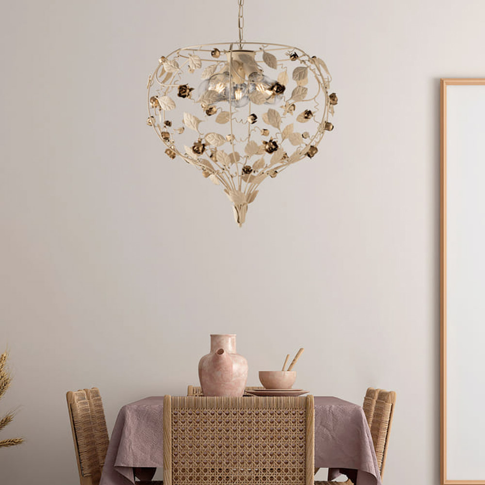 Elegant dhe dekorativ në mënyrë mahnitëse, ky llambadar hekuri i llakuar i punuar me dorë është një krijim i ndritshëm që përzien stilin klasik me stilin bashkëkohor dekorativ. Struktura mbështjellëse, e zbukuruar me elementë zbukurues të shpuar , krijon një lojë magjepsëse drite dhe hijeje, duke e bërë ndriçimin pikën qendrore të dhomës.