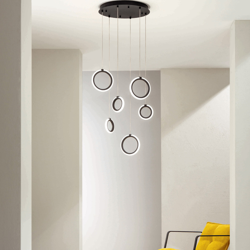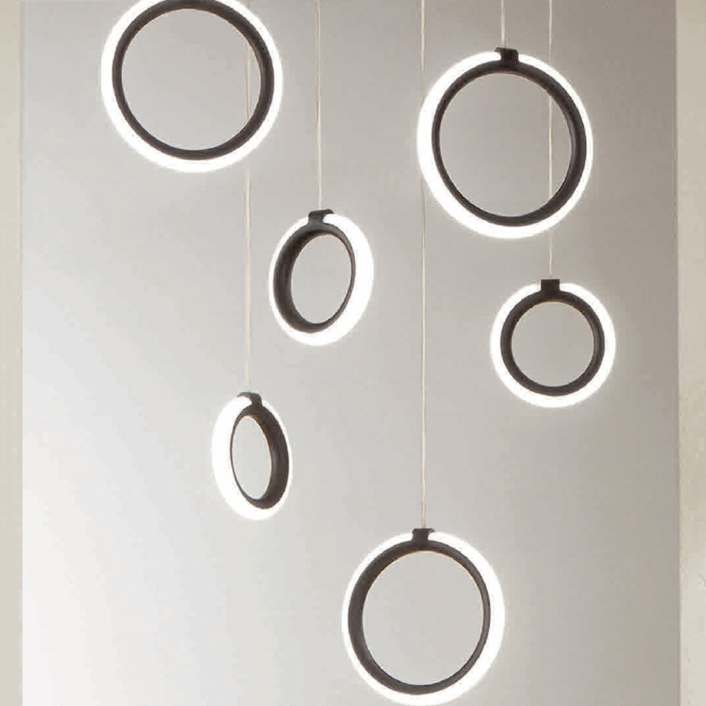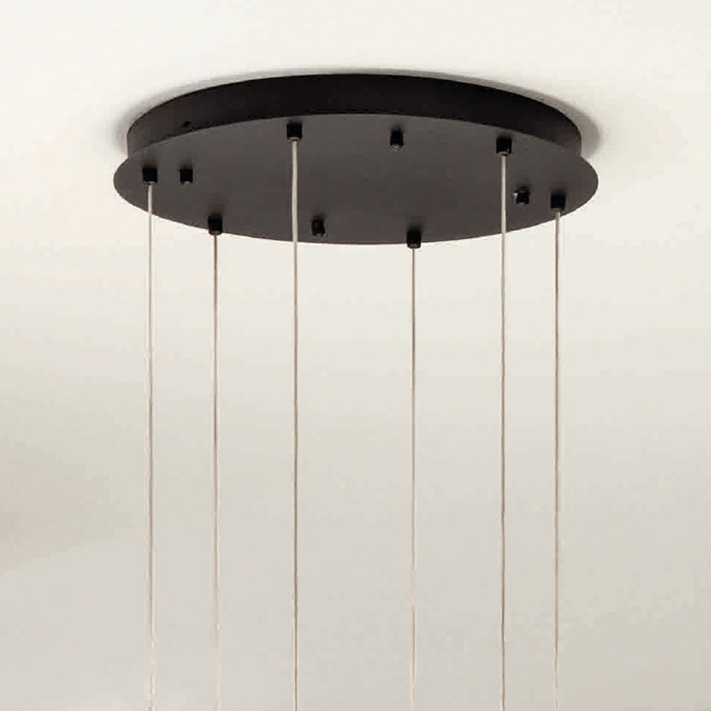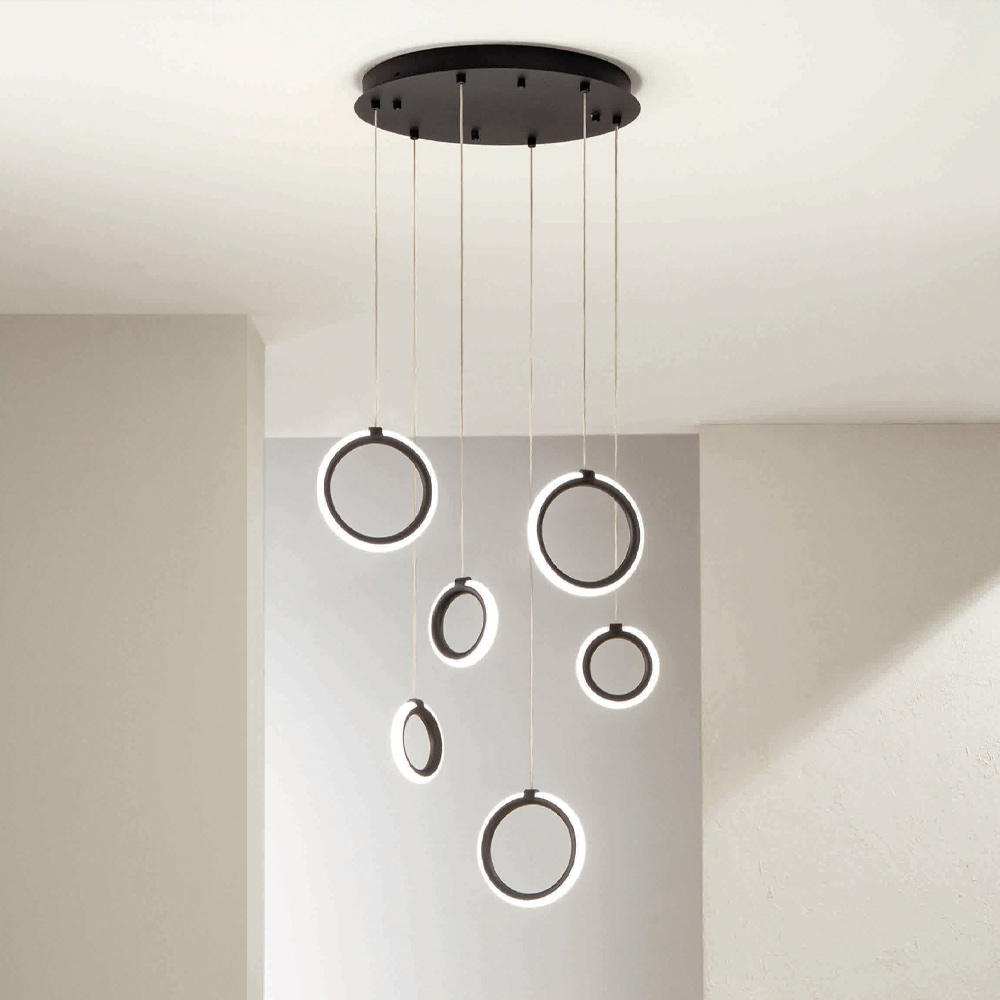 Llambadar tërësisht i prodhuar në Itali prej metali të lyer me ngjyrë të zezë me kabllo të rregullueshme në gjatësi dhe 6 drita LED me rreth të zbehtë . Ky produkt synon të përmirësojë traditën përmes një qasjeje bashkëkohore ku stili, klasi dhe inovacioni bashkohen për të krijuar formula të reja dizajni për të mobiluar dhe ndriçuar çdo ambient me shije dhe karakter. Pikat e forta janë veçantia e formave , cilësia e materialeve dhe veçantia e burimit të dritës .