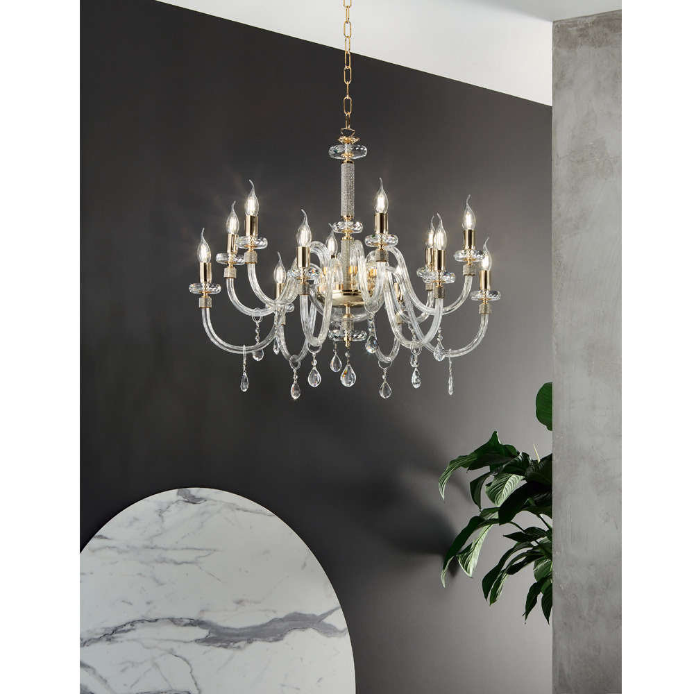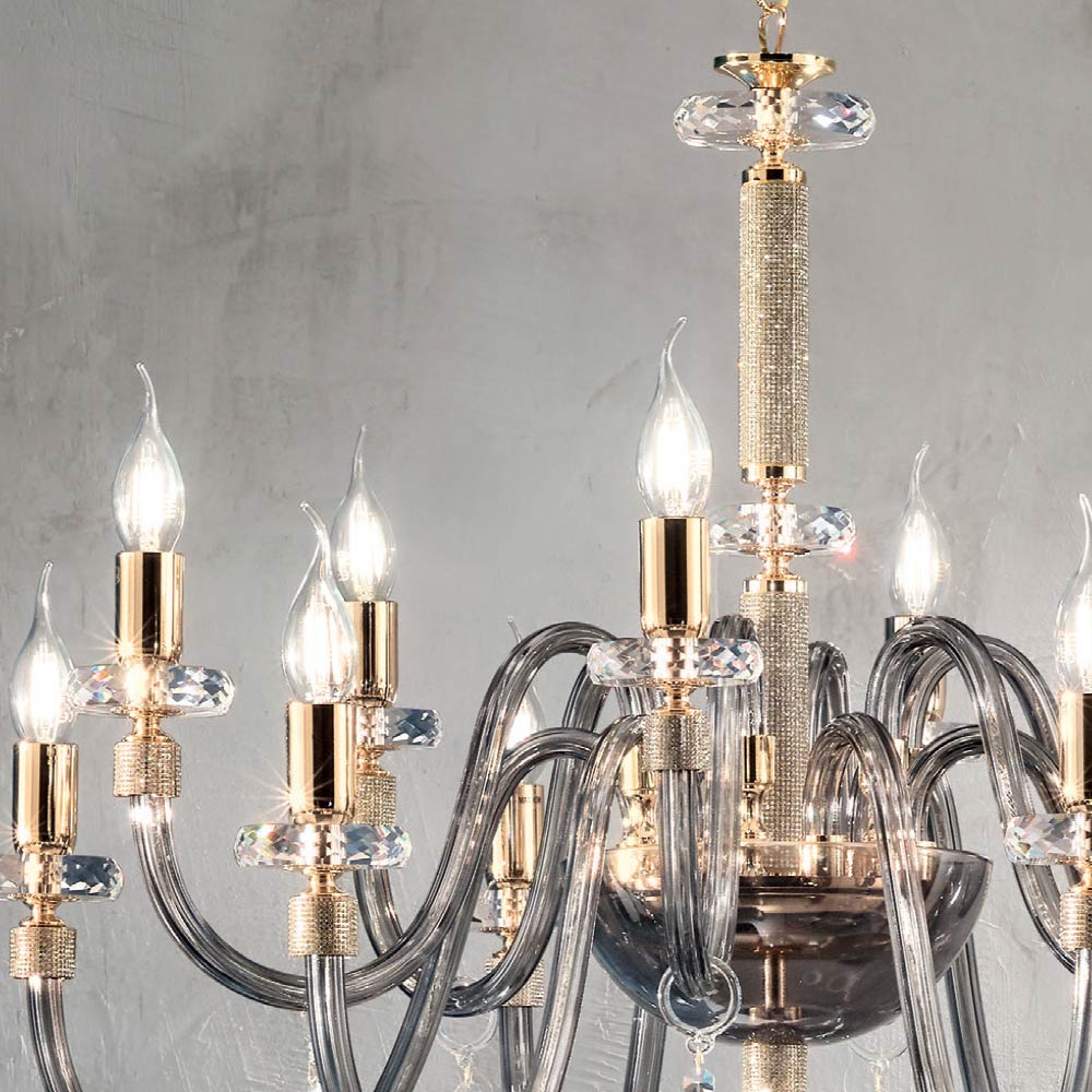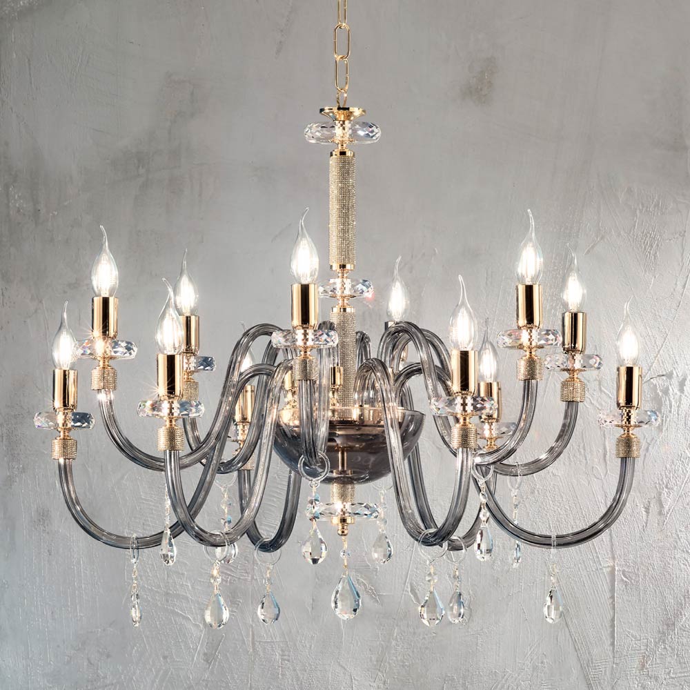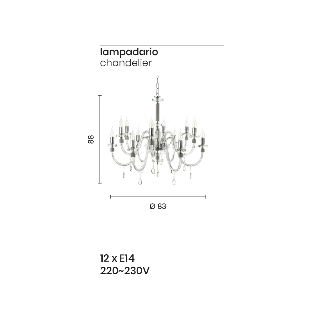 Ky llambadar varëse i stilit klasik përbëhet nga 12 krahë të harkuar prej xhami të punuar me dorë në Itali me një efekt "rigaton", fundi i të cilit është i rrethuar me shkëlqim të vendosur në metal, siç është pjesa qendrore e komplementit, ku dy tuba rrethorë mbështesin strukturën e ndërthurur me dy disqe rrethore të madhësive të ndryshme të bëra prej kristali të bluar.