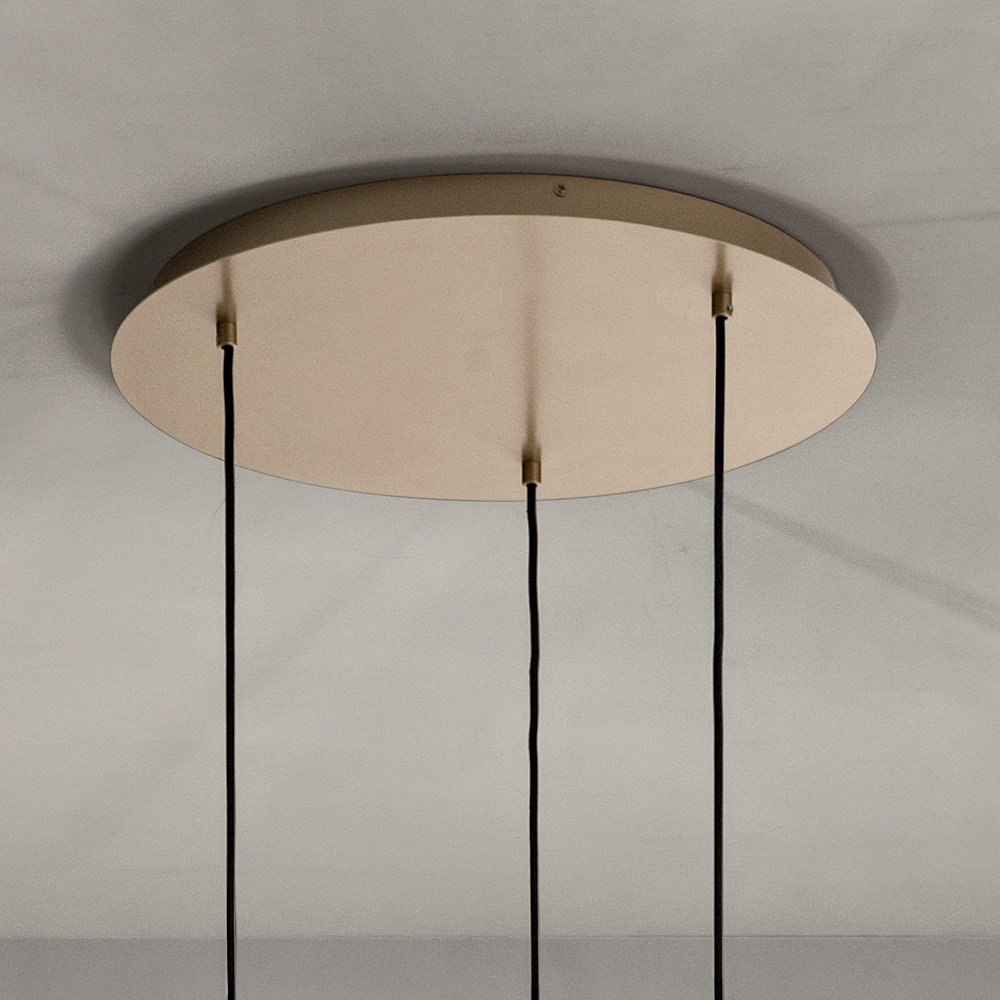 Llambadar i punuar me xham të fryrë në formë sferike me vijë gjysmësferike të ndarë në dy pjesë: një transparent dhe një me ngjyrë. Kornizë në metal të zi mat dhe bazament në tavan në metal ari . Kabllo të rregullueshme me gjatësi maksimale 250 cm.