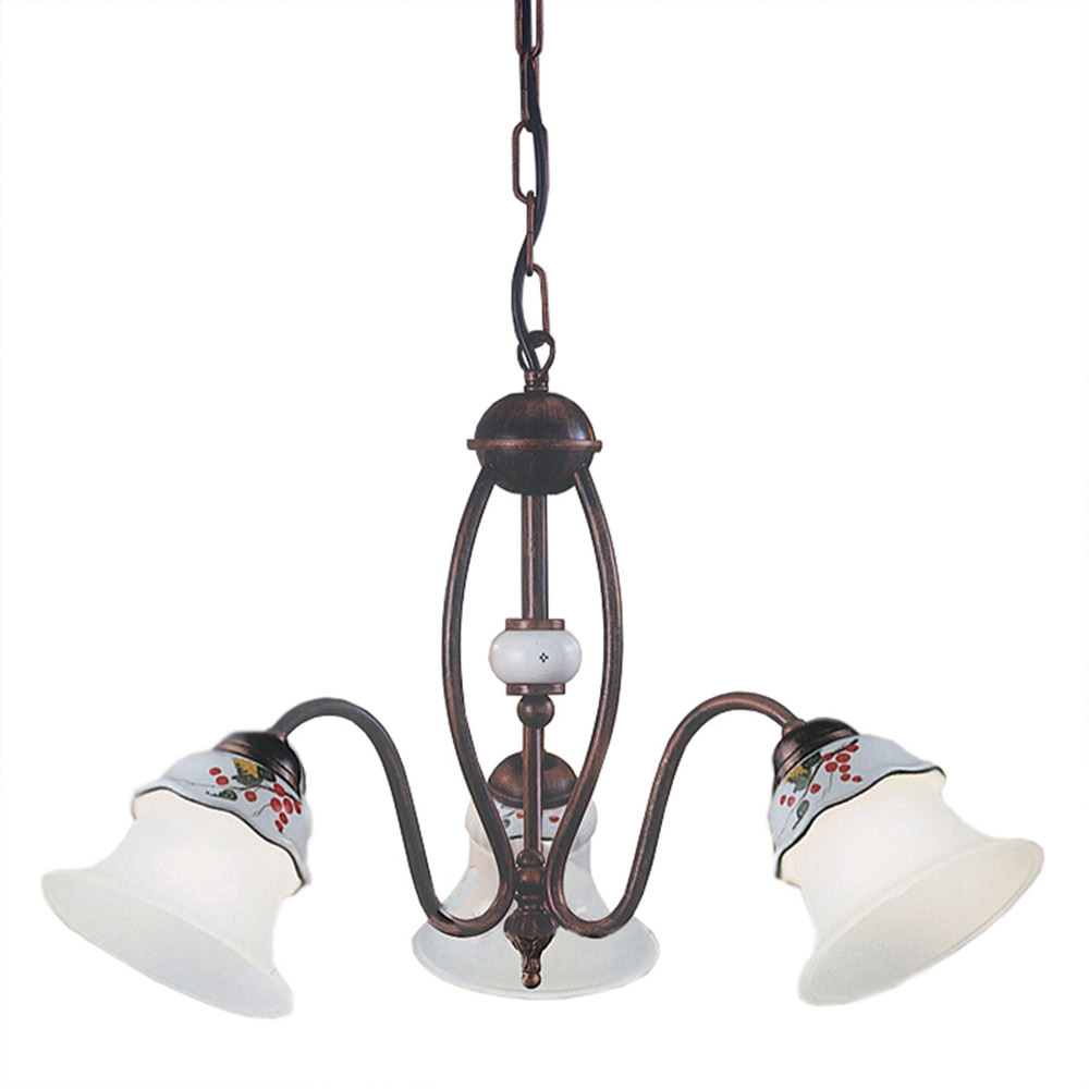 Llambadari me 3 ose 5 drita është tërësisht prej hekuri me fiston qeramike me dekorime të lyera me dorë dhe kambana xhami të etched që nxjerrin në pah mjeshtërinë dhe shkathtësinë e mjeshtrit.