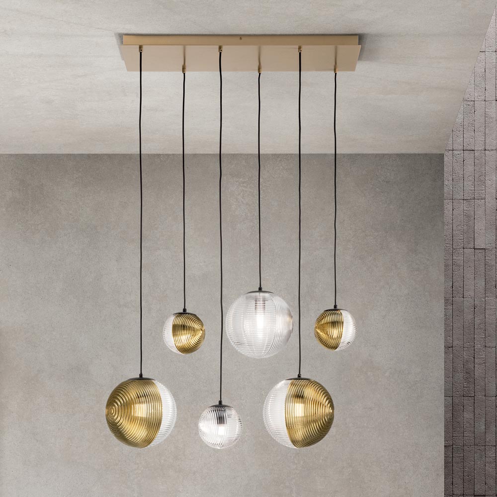 Zhytuni në një atmosferë të elegancës moderne me këtë llambadar varëse, perfekt për t'i shtuar një prekje luksi të nënvlerësuar çdo hapësire. Sferat shkëlqyese varen në një vallëzim harmonik drite dhe reflektimesh , secila e mbështjellë në xhami të fryrë me përfundime të ndryshme, duke reflektuar një dritë të ngrohtë dhe mikpritëse .