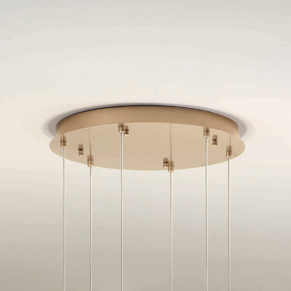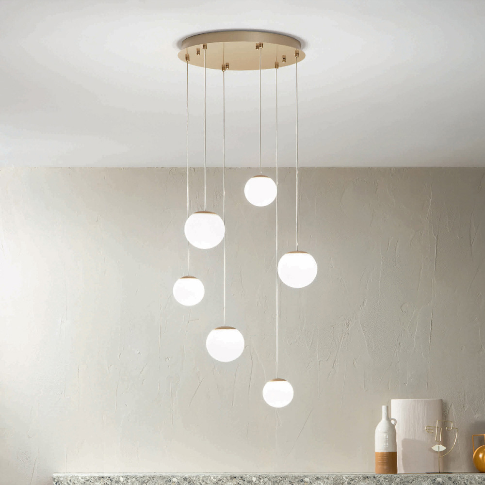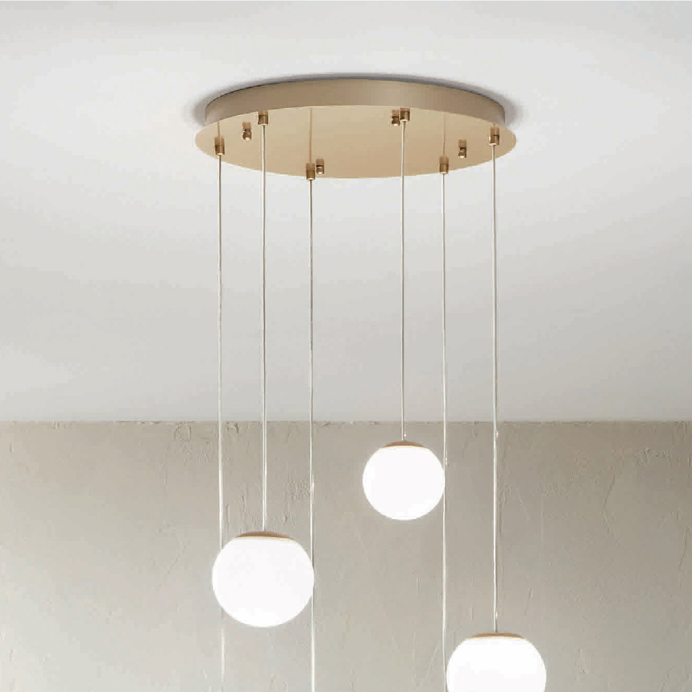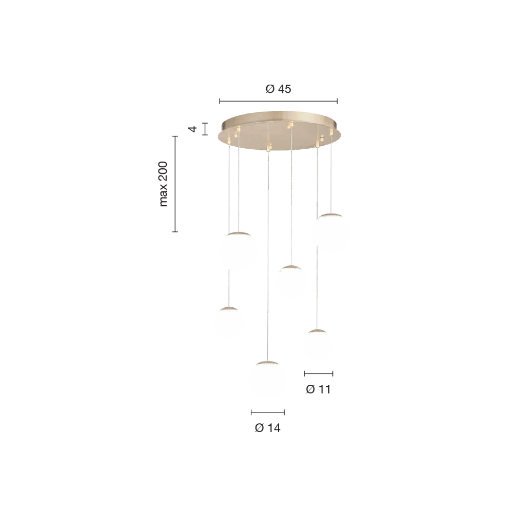 Llambadar tërësisht i prodhuar në Itali i bërë nga metali i lyer në ar dhe 6 drita LED me abazhur opsional në xham me ngjyrë që mund të hiqet duke zhveshur sferën e xhamit. Ky produkt synon të përmirësojë traditën përmes një qasjeje bashkëkohore ku stili, klasi dhe inovacioni bashkohen për të krijuar formula të reja dizajni për të mobiluar dhe ndriçuar çdo ambient me shije dhe karakter. Pikat e forta janë veçantia e formave , cilësia e materialeve dhe veçantia e burimit të dritës .