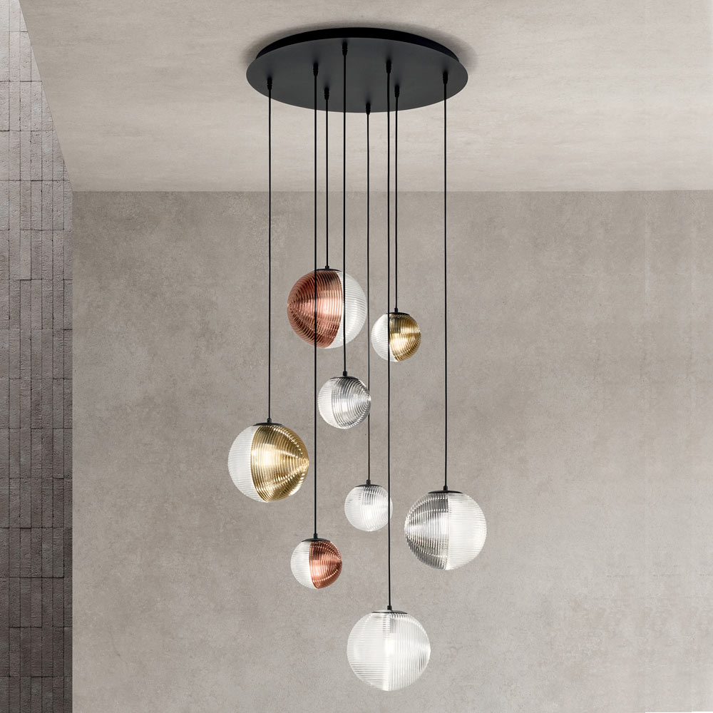 Zhytuni në një atmosferë të elegancës moderne me këtë llambadar varëse, perfekt për t'i shtuar një prekje luksi të nënvlerësuar çdo hapësire. Sferat shkëlqyese varen në një vallëzim harmonik drite dhe reflektimesh , secila e mbështjellë në xhami të fryrë me përfundime të ndryshme, duke reflektuar një dritë të ngrohtë dhe mikpritëse .